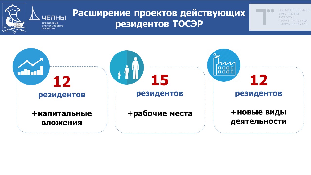 Заместитель руководителя Исполнительного комитета Наталия Кропотова сообщила, что на сегодняшний день статус резидента ТОСЭР в Набережных Челнах присвоен 38 производственным компаниям, которые инвестировали в экономику города около 23 млрд рублей и создали 6526 новых рабочих мест.