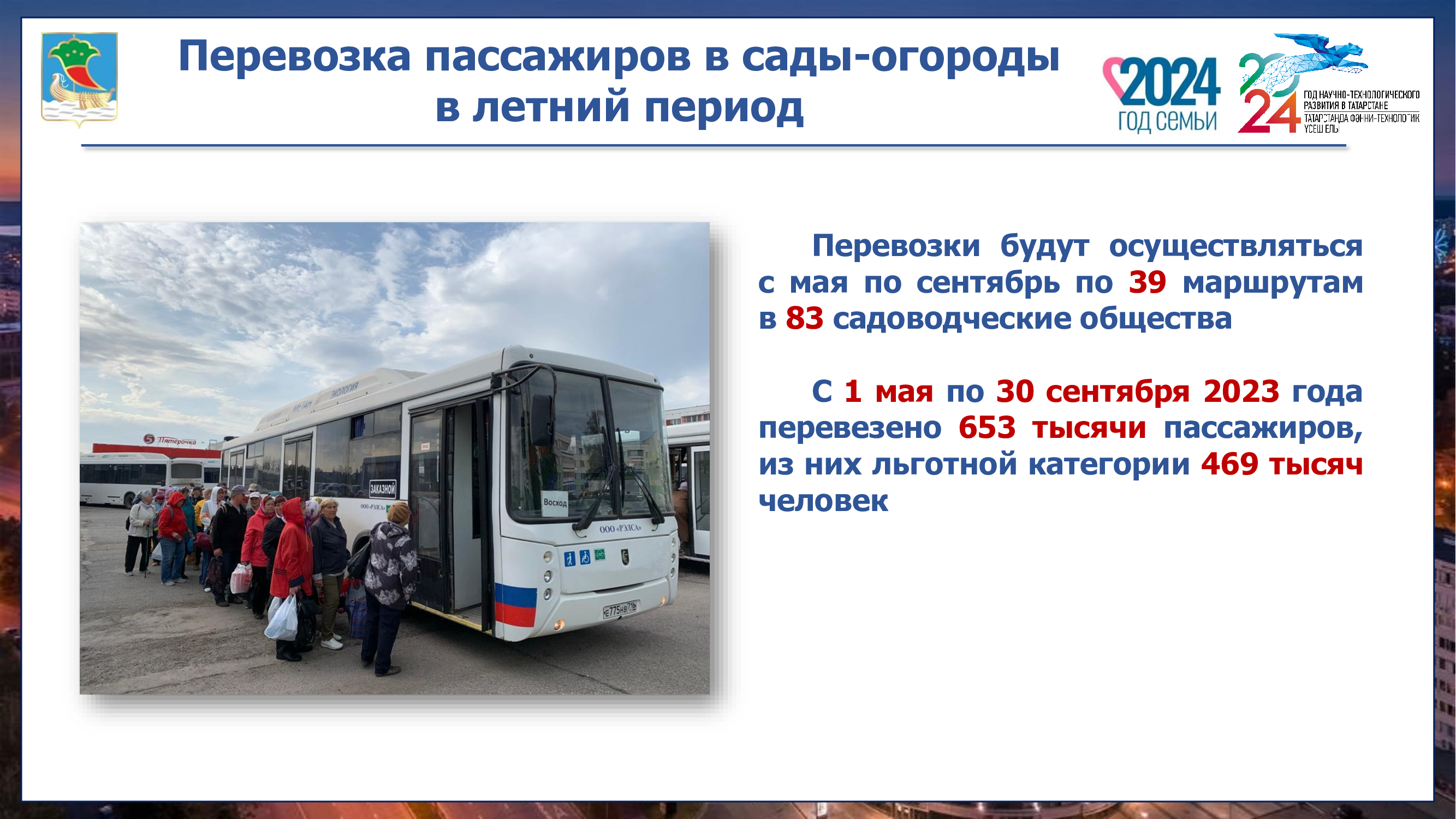 Набережные Челны – единственный город в Республике Татарстан, который финансирует перевозки в сады и огороды за счет городского бюджета. Эта работа ведется с 2005 года. В текущем году на эти цели выделено 20 миллионов рублей. Перевозками займутся компании «Альтекс» и «АВАНТЕХ».