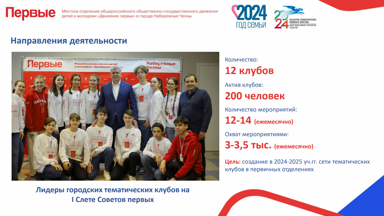 Для реализации основных направлений деятельности «Движения Первых» в Набережных Челнах сформировано 12 тематических клубов. Общий состав актива составляет более 200 человек.