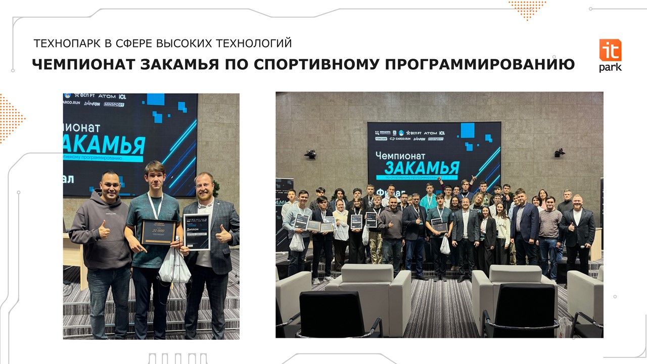 В октябре этого года впервые прошли соревнования по спортивному программированию, в которых приняли участие более 150 школьников и студентов Закамского региона. Важность этого события подчеркивает присвоение участникам соревнований первых разрядов по спортивному программированию федерального и республиканского уровней. Партнерами мероприятия стали резиденты технопарка, которым дали возможность участникам пройти стажировку в своих компаниях, среди них «Атом», «Каргоран» и компания-партнер АЙСЛ.