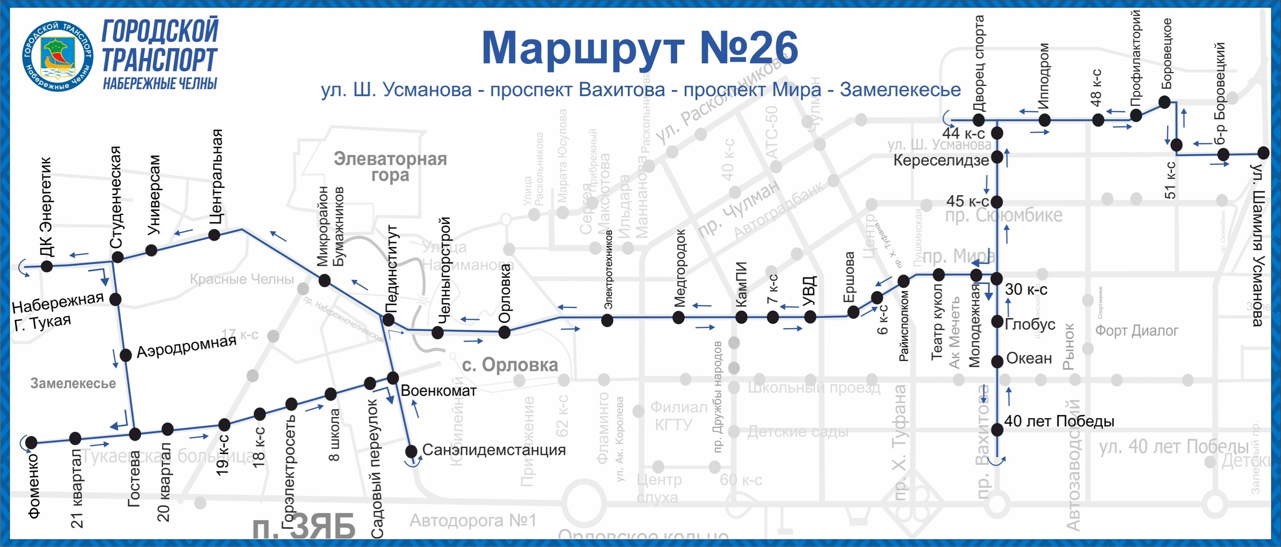 Маршрут №26 продолжит работу, схема его движения отличается от прежней тем, что теперь он закольцован, то есть, он не заезжает на Мясокомбинат, а едет до остановки «ДК Энергетик», разворачивается, не доезжая до остановки «Парк культуры», по улице Гостева доезжает до проспекта Фоменко и далее по старому варианту движения выезжает на остановку «Пединститут».