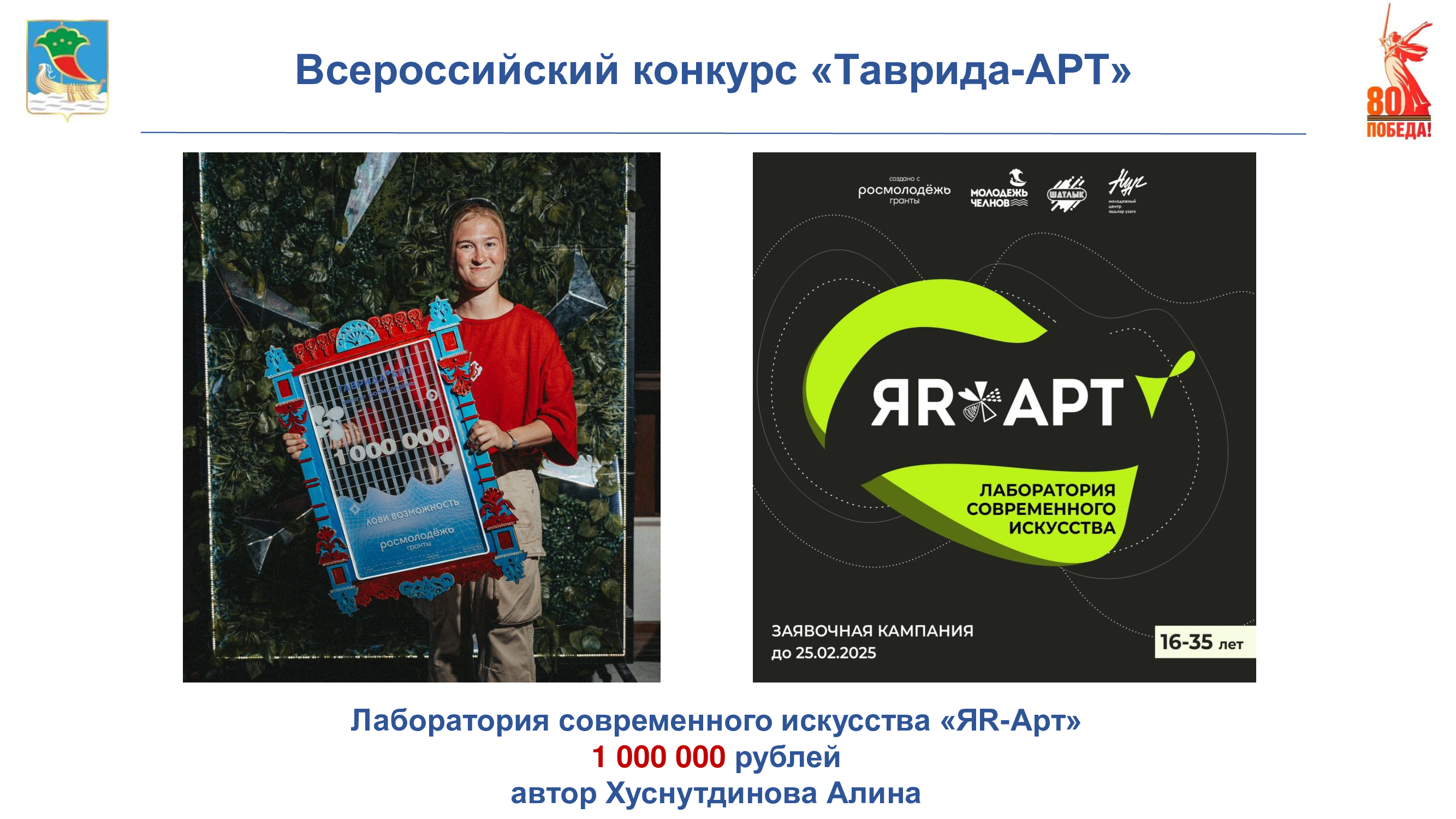 Лаборатория современного искусства «ЯR-Арт»: участниками будут созданы арт-объекты, творческие работы и арт-проекты, которые в дальнейшем будут интегрированы в общественные пространства города. В рамках проекта состоится работа лабораторий по девяти направлениям искусства и творчества. Итоговым мероприятием станет Фестиваль современного искусства, который пройдет летом 2025 года.
