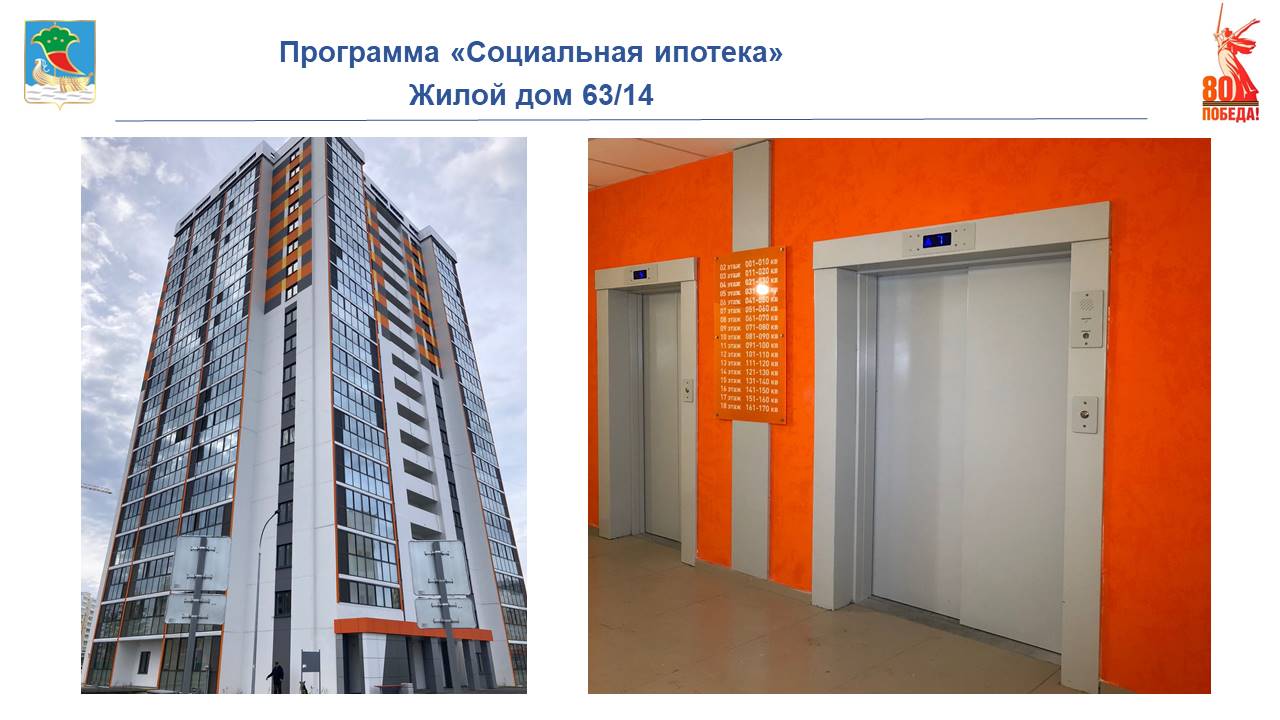 Одним из приоритетных направлений является строительство жилья по программе «Социальная ипотека». В настоящее время очередность по программе составляет 1 068 семей. За отчетный период введены в эксплуатацию многоквартирные жилые дома 63/14, 69/17 и 69/18 на 510 квартир. Строительство жилья по программе социальная ипотека в городе продолжится.