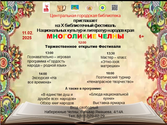 11 февраля в Центральной городской библиотеке пройдет библиотечный фестиваль национальных культур и литератур народов края — «Многоликие Челны». Фестиваль будет организован совместно с Домом дружбы народов «Родник».