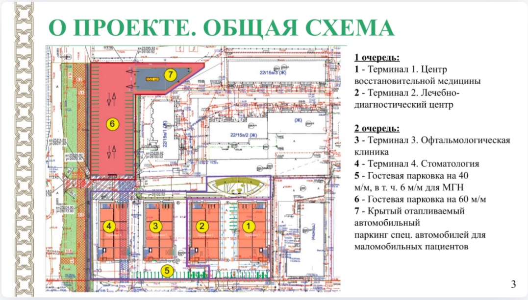 Помимо всего этого будет построен крытый отапливаемый автомобильный паркинг для маломобильных пацинетов и гостевые парковки на 100 машиномест.