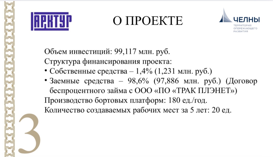 Третий проект "Арткур" предполагает объем инвестиций в размере 100 млн рублей. В Набережных Челнах планируют производить бортовые платформы. Основными потребителями такой продукции являются производители спецтехники. Грузовые платформы предназначены для транспортировки широкого спектра товаров, которые не нуждаются в соблюдении специальных температурных условий. Проект планируется запустить в 2027 году.
