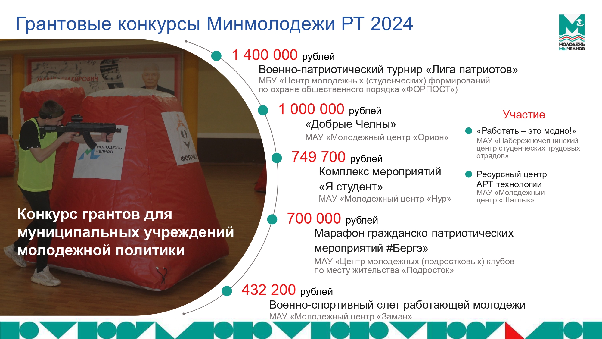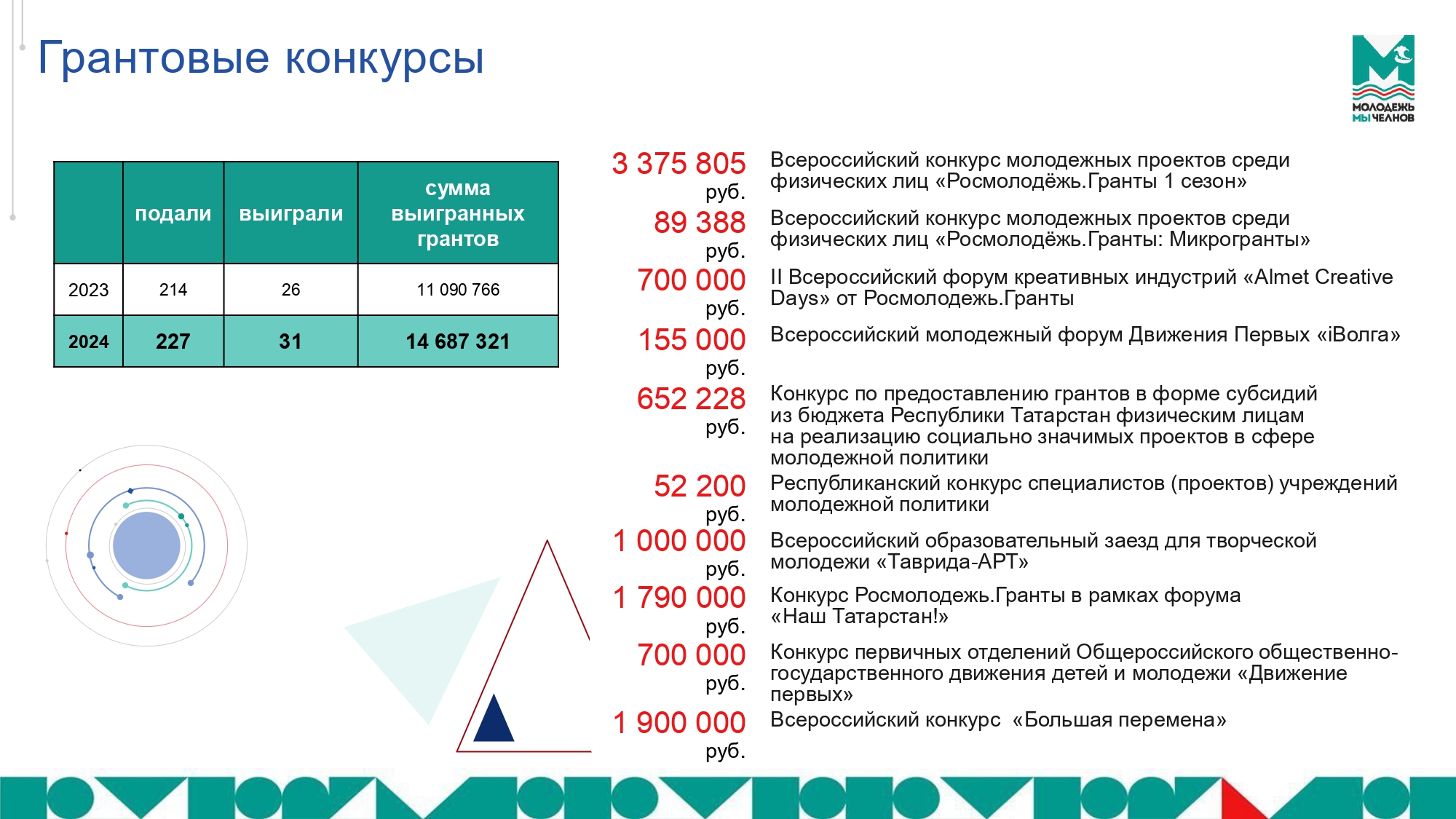 Челнинская молодежь ежегодно становится победителями и призерами в различных грантовых конкурсах. В 2024 году подано 227 заявок. Выиграно 31 проектов на сумму 14 687 321 рублей.