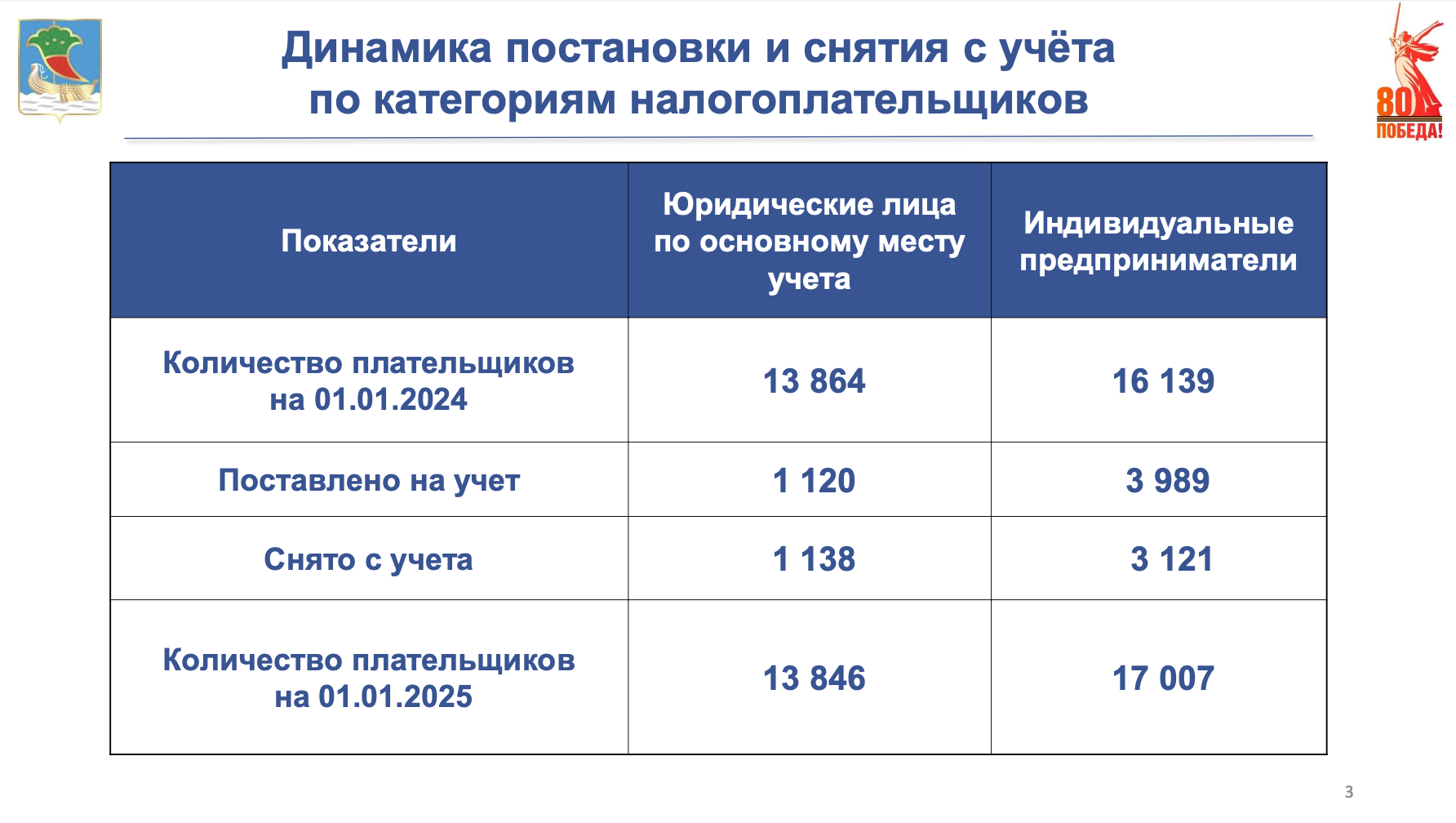 По состоянию на начало текущего года Инспекция ФНС по городу Набережные Челны администрирует более 17 тысяч юридических лиц и столько же индивидуальных предпринимателей, 48 тысяч «самозанятых» и более полумиллиона физических лиц. Динамика постановки и снятия с учета налогоплательщиков представлена на слайде.В консолидированный бюджет Российской Федерации с территории города зачислено 140 млрд рублей, что на 17 млрд рублей больше уровня 2023 года. В федеральный бюджет поступило 90 млрд рублей, с ростом на 6,6 млрд рублейв республиканский бюджет мобилизовано 40 млрд рублей, что больше на 5 млрд рублей, в городской бюджет поступило 9,5 млрд рублей, что больше на 2 млрд рублей. Во внебюджетные фонды поступило 48 млрд рублей, что на 35% больше показателя 2023 годаИмущественные налоги физических лиц в консолидированный бюджет Республики Татарстан составили 1 млрд 221 млн рублей, с ростом на 7%.