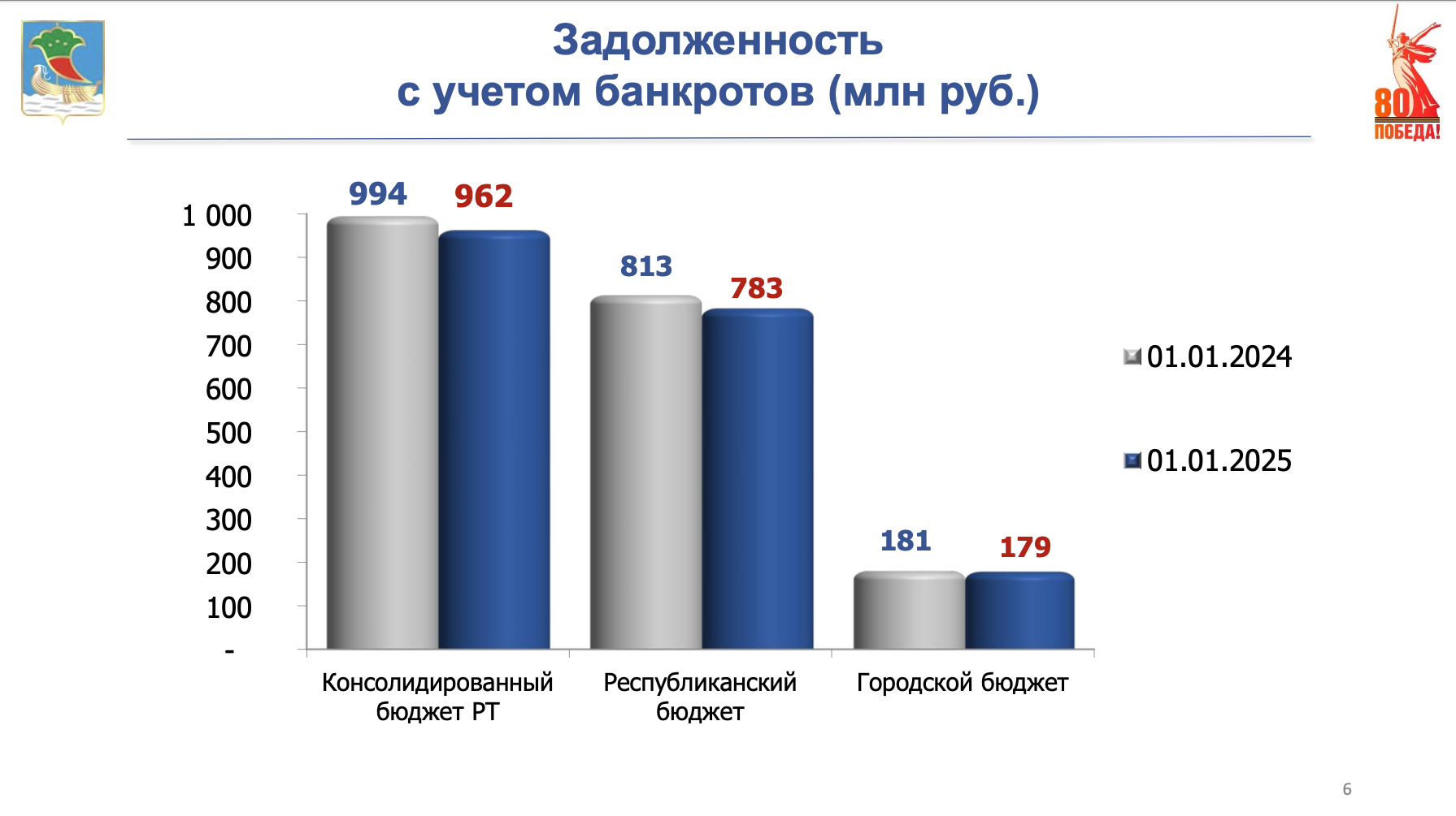 Совокупная сумма задолженности в консолидированный бюджет Республики Татарстан с учетом банкротов и ликвидированных предприятий по состоянию на 1 января 2025 года составила 962 млн рублей, в том числе в городской бюджет – 179 млн рублей. Снижение задолженности в республиканский бюджет на конец года составило 32 млн рублей или 3%, в городской бюджет – 2 млн рублей или 1%.