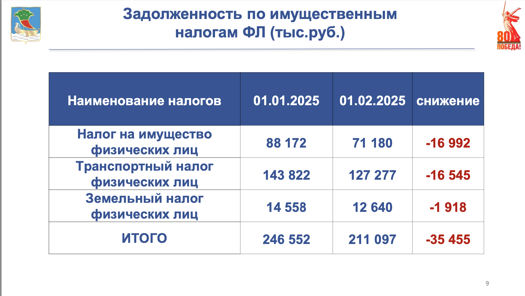 Несмотря на общее снижение задолженности по имущественным налогам к началу года на 8,7% или на 23 млн рублей, ее уровень по состоянию на 1 января 2025 года все же остается значительным и составляет 246 млн рублей.