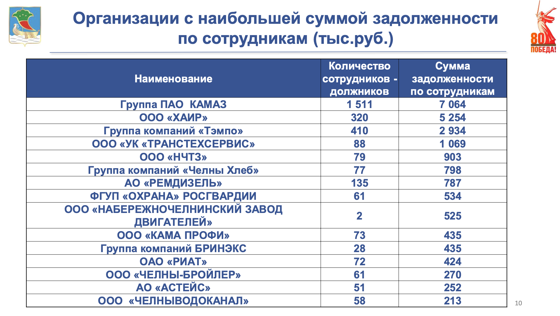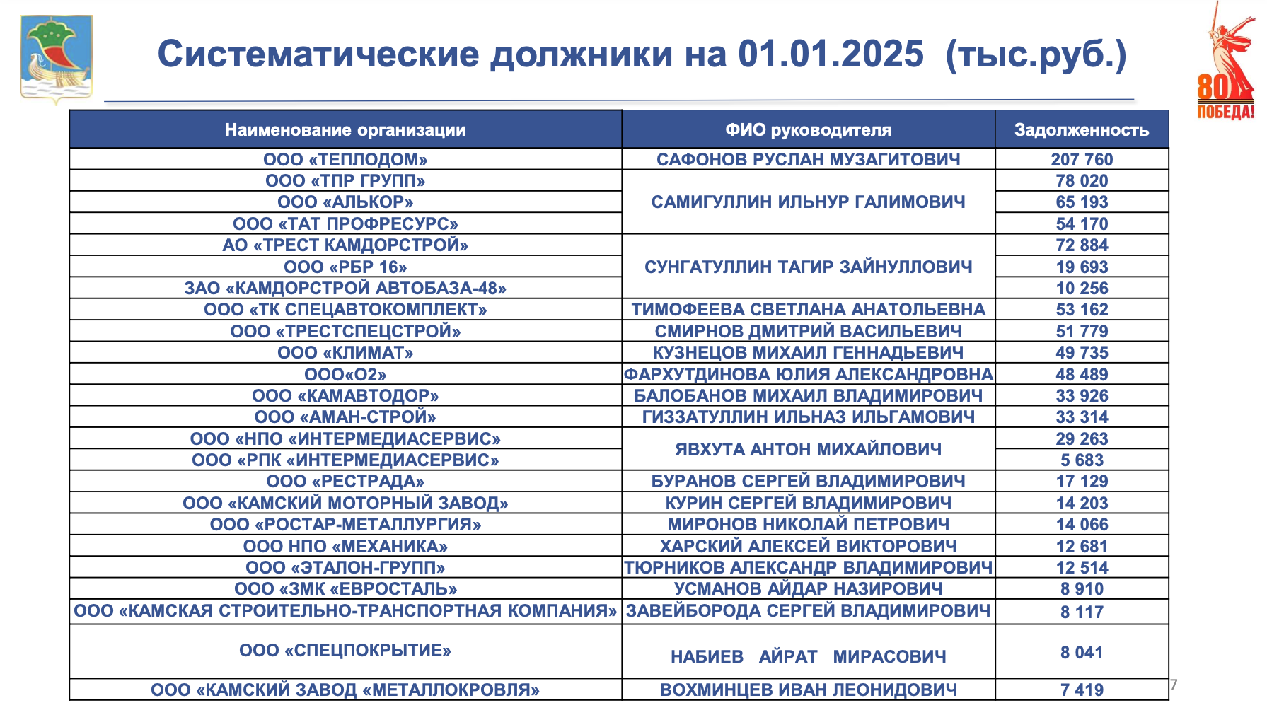 «Несмотря на проведенную в конце 2024 года совместную работу с крупными организациями города по уплате их работниками налогов и сборов, к сожалению, задолженность их сотрудников перед бюджетом на сегодняшний день остается значительной», – отметила Диана Сагетдинова.