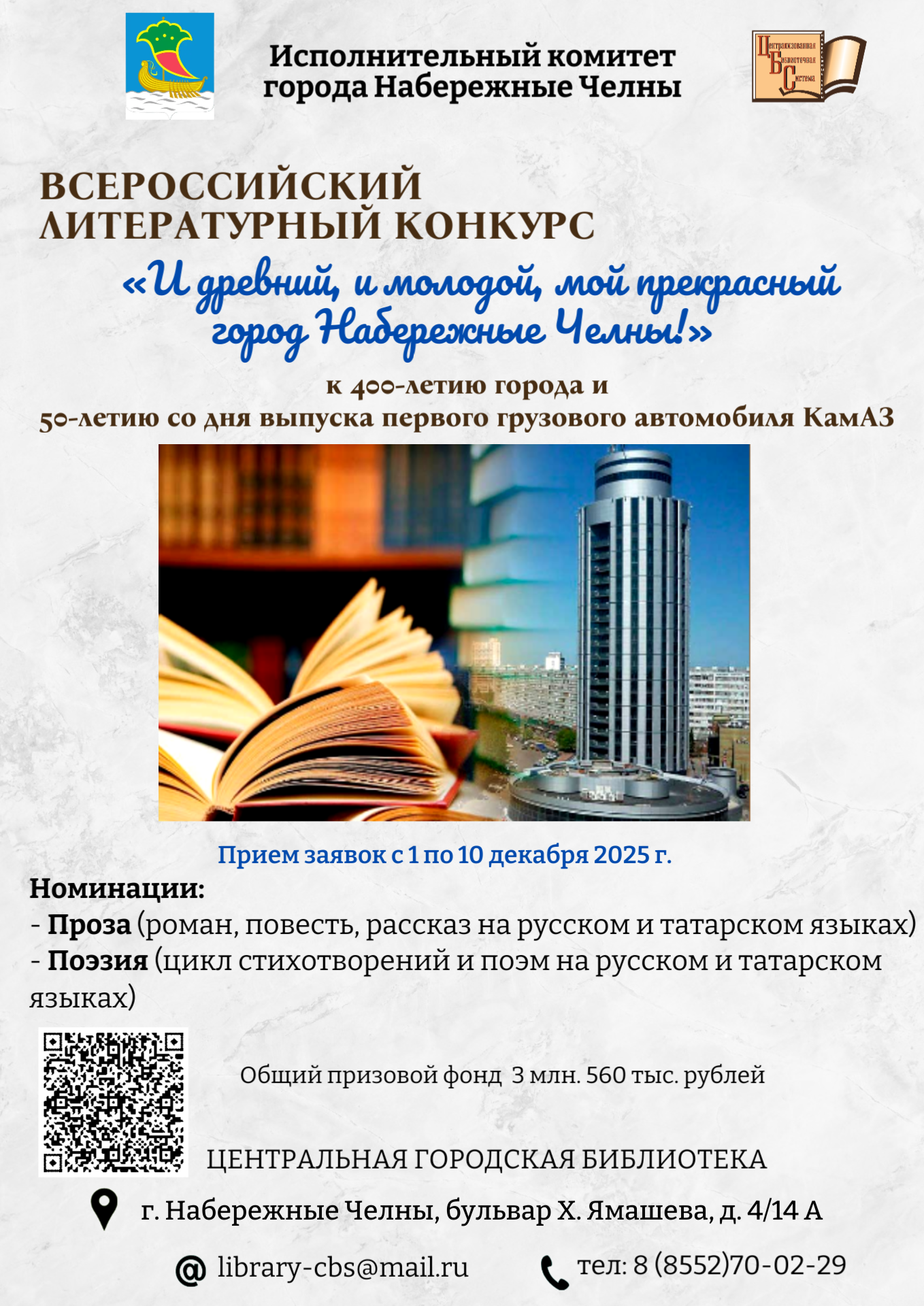 Исполнительный комитет Набережных Челнов проводит Всероссийский литературный конкурс «И древний, и молодой, мой прекрасный город Набережные Челны!» в честь 400-летия города и 50-летия со дня выпуска первого грузового автомобиля «КАМАЗ». Конкурс должен простимулировать интерес к культурному, историческому, трудовому и патриотическому наследию Набережных Челнов и привлечь внимание к выдающимся личностям, внесшим значительный вклад в его развитие.