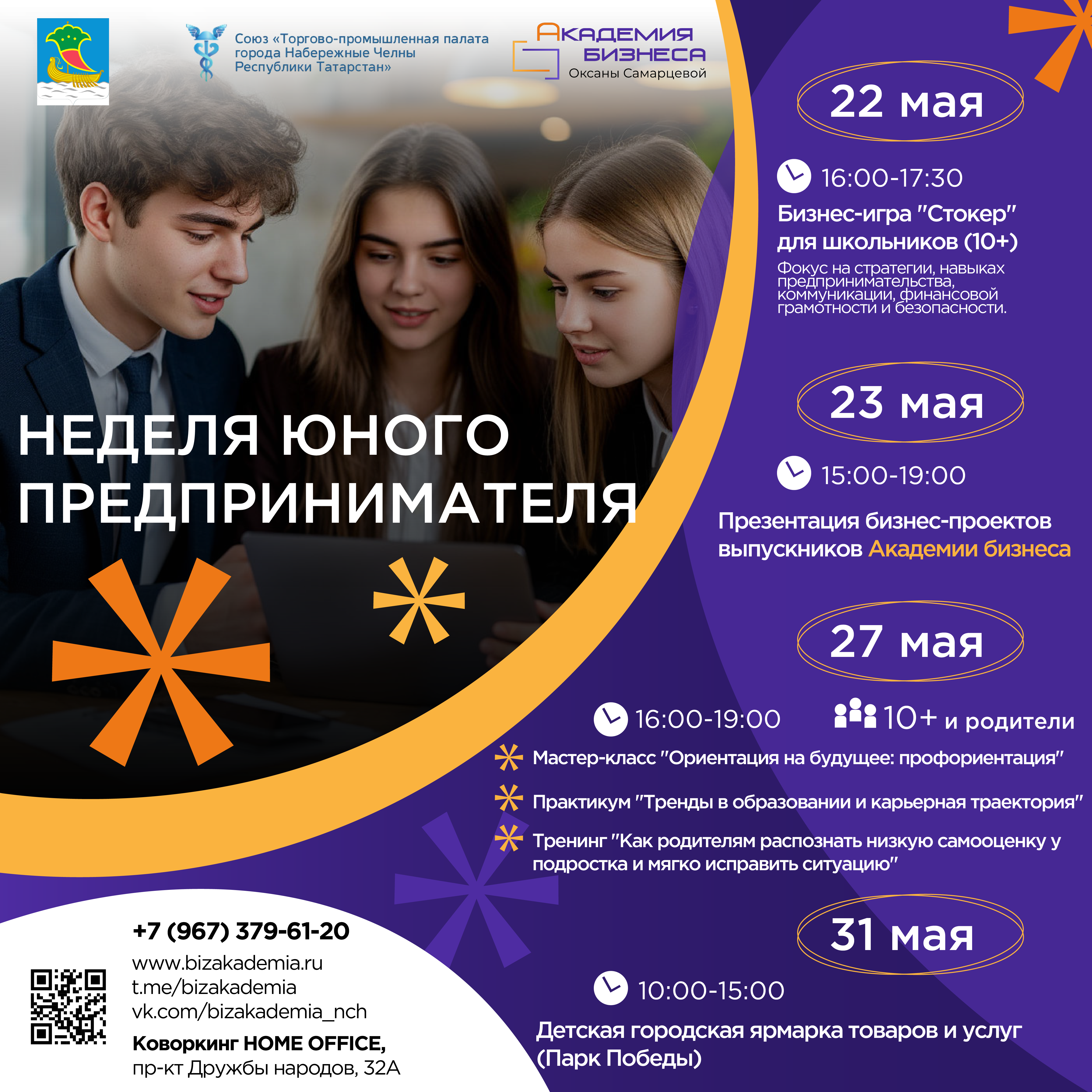 График такой: 22 мая — бизнес-игра «Стокер» для детей от 10 лет и родителей; 23 мая – презентация проектов выпускников шестого года выпуска Академии бизнеса; 27 мая — День юного предпринимателя для детей от 10 до 17 лет и родителей; 31 мая — ярмарка возможностей для детей от восьми лет в Парке Победы