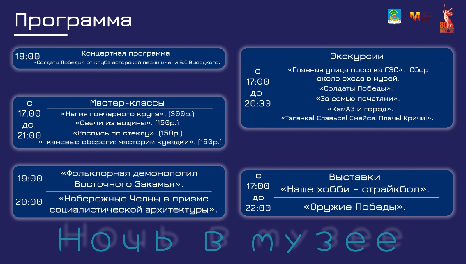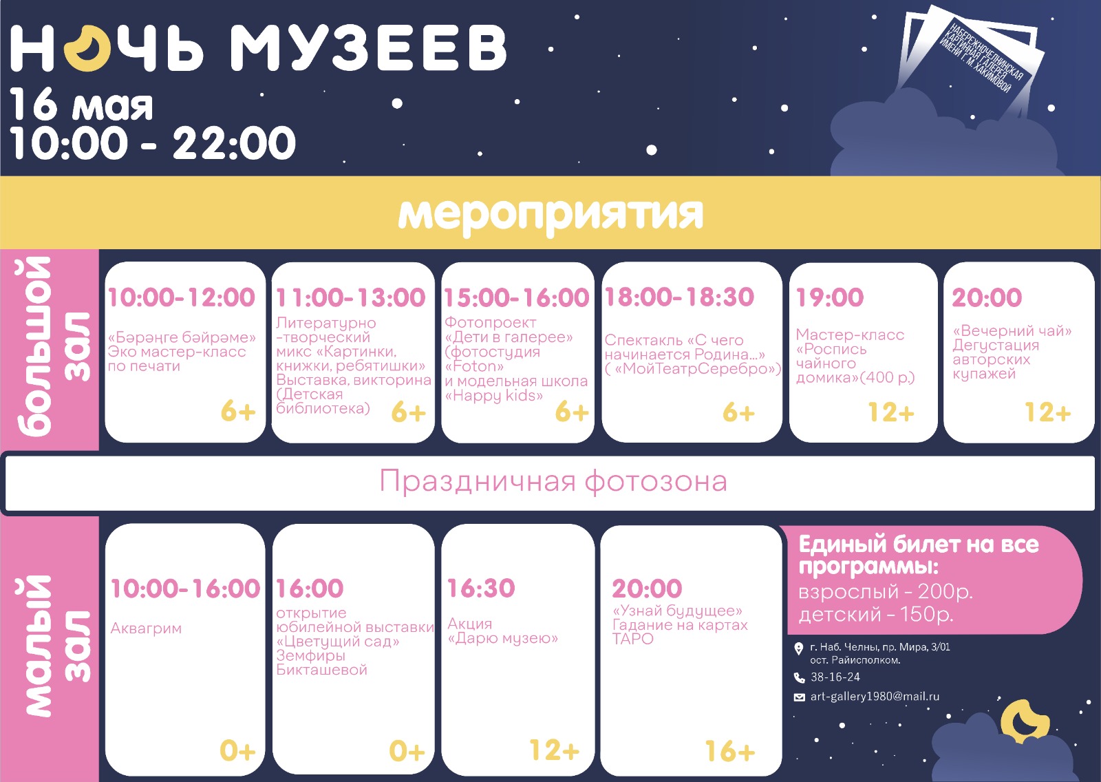 15 май көнендә картиналар галереясендә «Музейда төн» дигән акция уза. Быел акция чаралары бер үк вакытта шәһәрнең өч мәдәни мәйданчыгында үткәрелә: шәһәрнең тарихи-туган якны өйрәнү музеенда, экология һәм табигатьне саклау музеенда һәм Чаллының картиналар галереясендә уза.