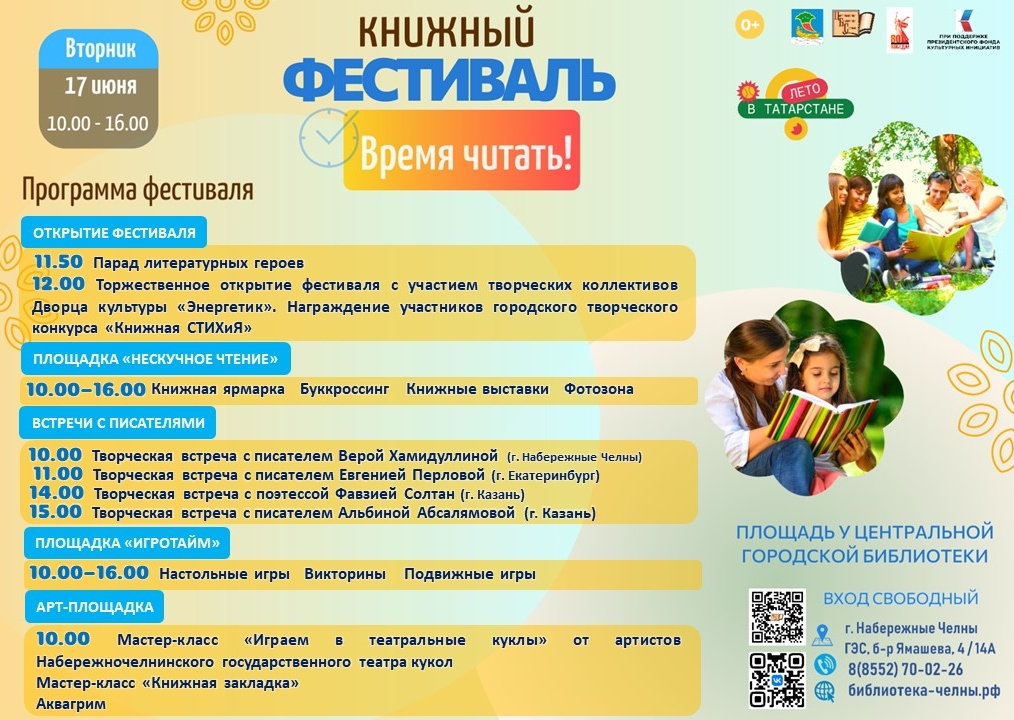 Парад литературных героев, книжная ярмарка, автограф-сессия, игры и конкурсы: 17 июня 2025 года на площади перед Центральной городской библиотекой пройдет праздник книги — книжный фестиваль «Время читать!». Мероприятие посвящено 50-летию библиотечной системы Набережных Челнов.