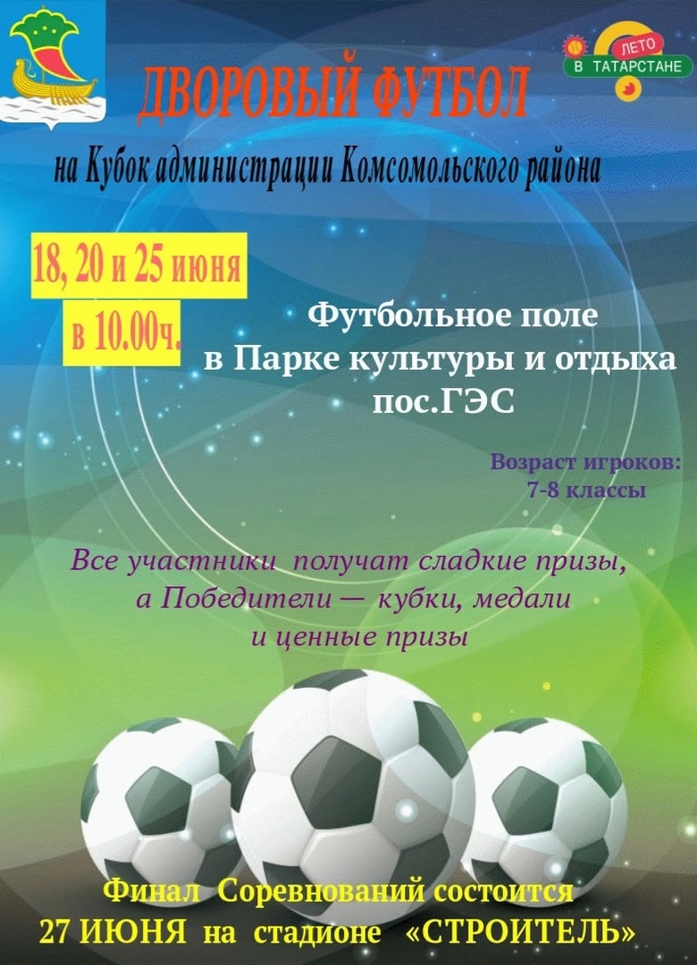 В Комсомольском районе пройдут соревнования по дворовому футболу. Футбольные матчи состоятся на спортивной площадке парка культуры и отдыха пос. ГЭС 18, 20 и 25 июня в 10:00.