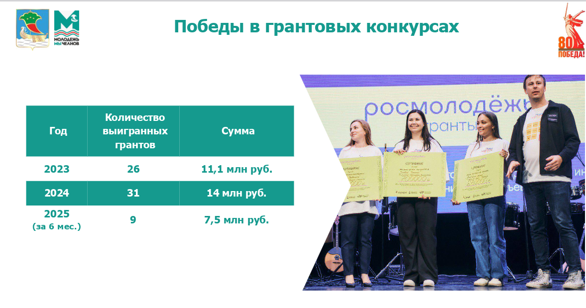 Челниская молодежь за шесть месяцев 2025 года выиграла девять грантов на сумму 7,5 млн рублей. Об этом на аппаратном совещании рассказала начальник управления по делам молодежи Лейсан Видинеева.