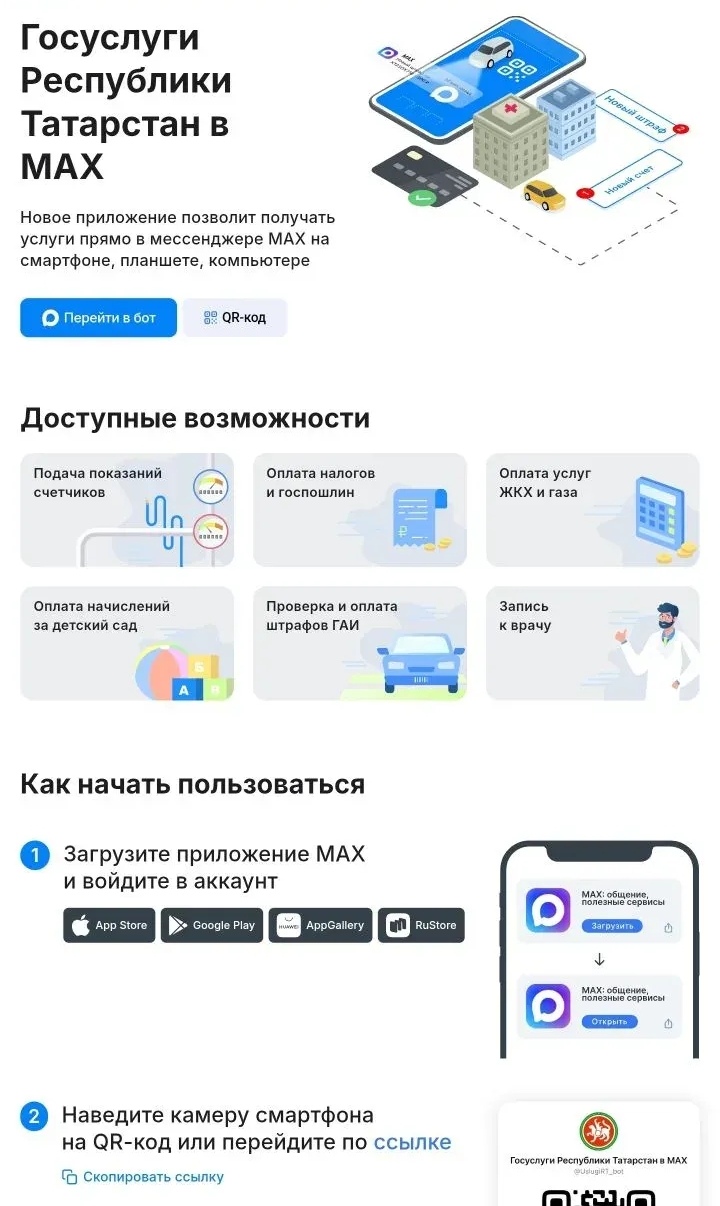 В мессенджере MAX заработал специальный чат-бот «Госуслуги Республики Татарстан», с помощью которого можно получать необходимые сервисы дистанционно, без посещения государственных учреждений. Например, можно подать показания счетчиков, оплатить налоги и госпошлины, оплатить услуги ЖКХ и газа, оплатить начисления за детский сад, проверить и оплатить штрафы ГАИ, записаться к врачу.