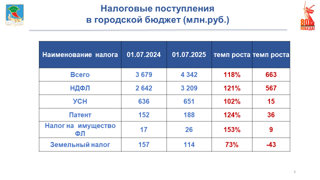 Поступления в городской бюджет составляют: налог на доходы физических лиц зачислен в сумме 3 млрд 209 млн рублей, единый налог, взимаемый в связи с применением упрощенной системы налогообложения – 651 млн рублей, взимаемый в связи с применением патентной системы налогообложения налог поступил в сумме 188 млн рублей, налог на имущество физических лиц – 26 млн рублей, поступление земельного налога составило 114 млн рублей.