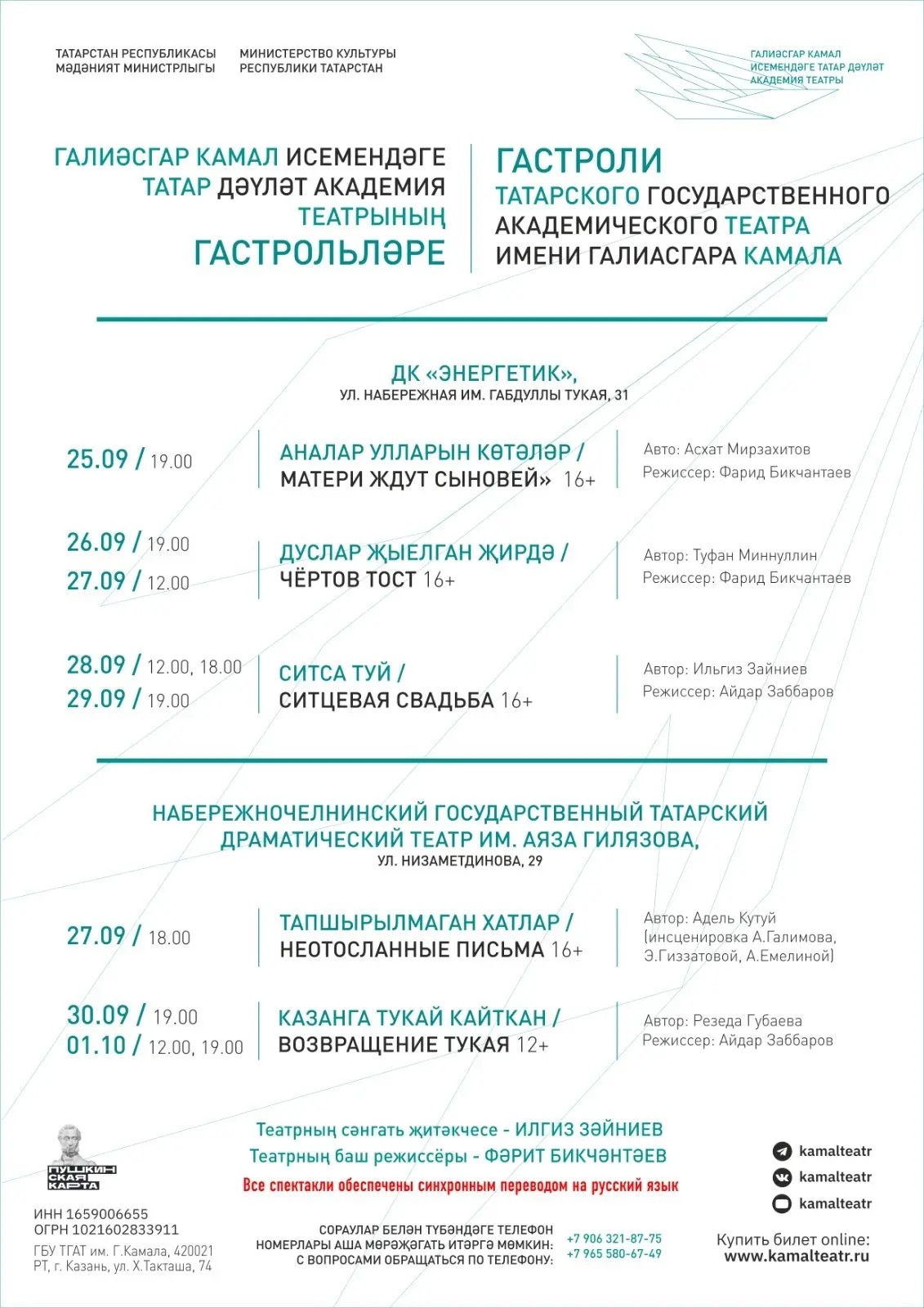 «Традиционные наши гастроли начинаются с Набережных Челнов, мы любим челнинского зрителя за то, что он очень активный. 25 сентября открываем традиционные гастроли во дворце культуры «Энергетик» со спектаклем «Матери ждут сыновей». Это спектакль на военную тему, в нем описываются послевоенные годы. Режиссер Фарид Бикчантаев выбрал именно эту тему. Этот спектакль больше о человеческих судьбах», — подчеркивает Ильфир Якупов.