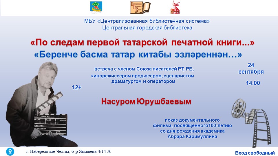 24 сентября в 14:00 Центральная городская библиотека приглашает всех желающих на творческую встречу с членом Союза писателей РТ, РБ, режиссером, продюсером, сценаристом и оператором Насуром Юрушбаевым.
