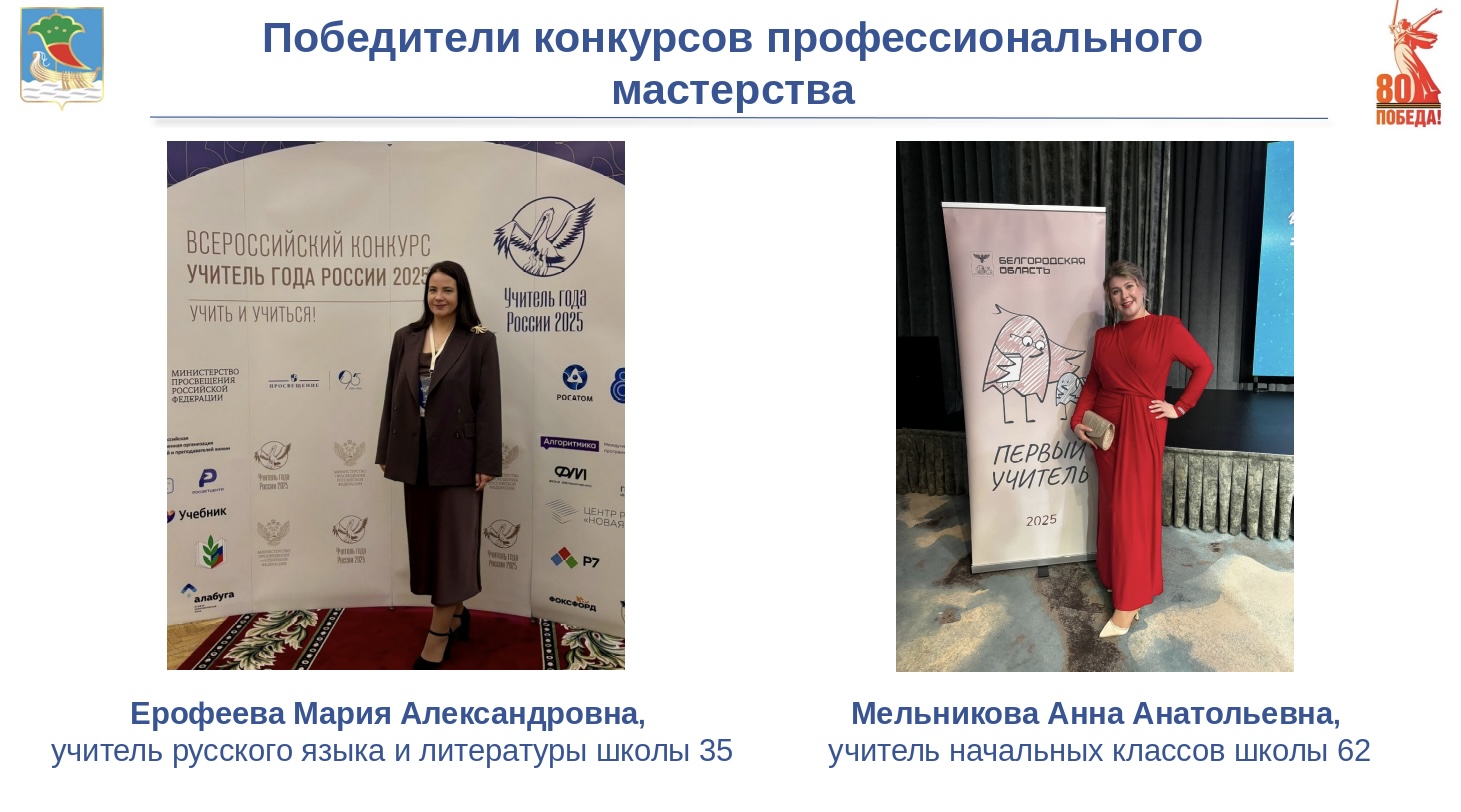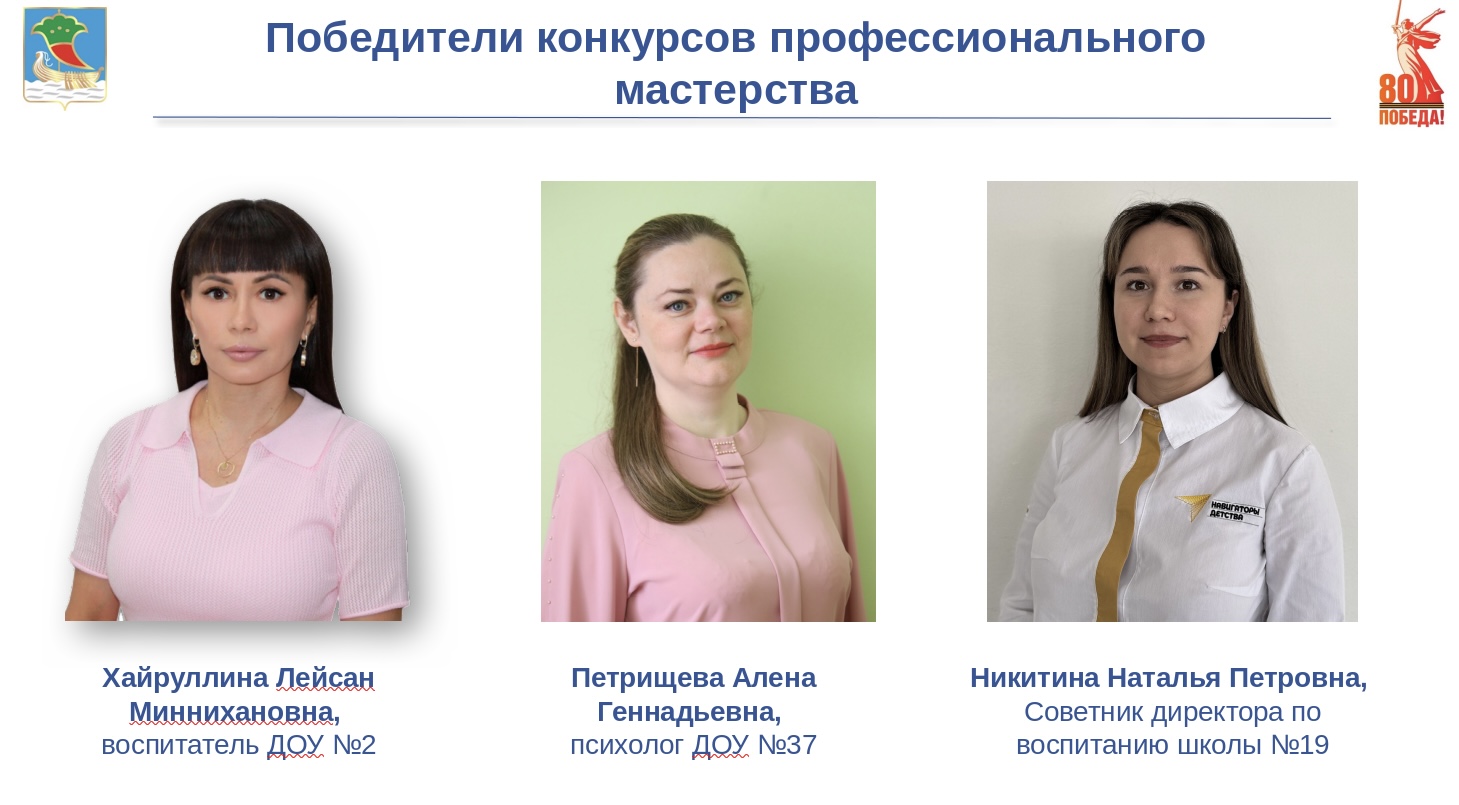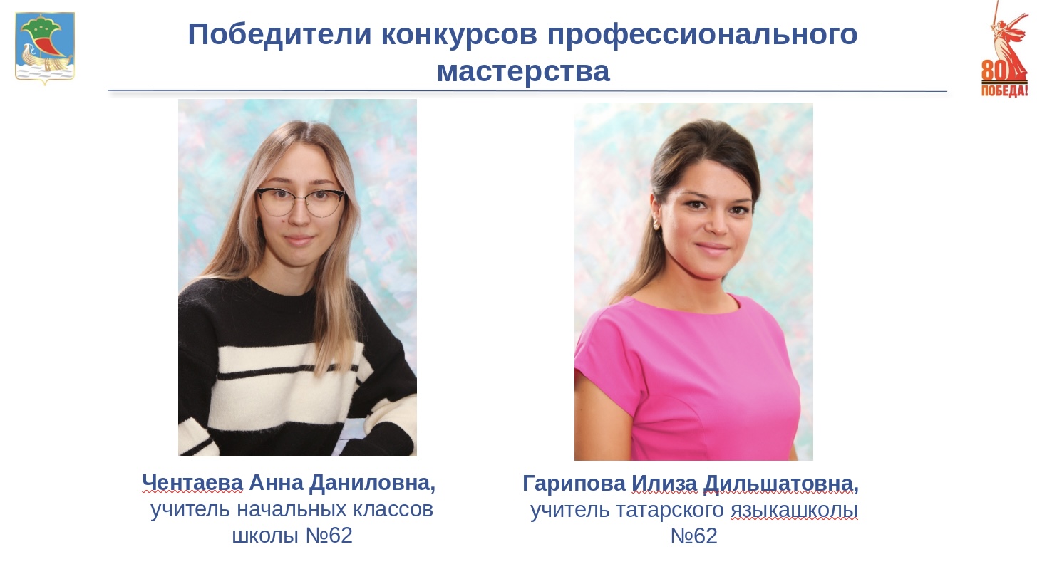 Челнинские педагоги защищают честь города и республики на Всероссийских конкурсах – это преподаватель Детской школы искусств №7 Лидия Ивановна Петрова; педагог дополнительного образования детского оздоровительного центра №8 «Дельфин» в конкурсе «Сердце отдаю детям» Майя Мирабовна Дубовая; учитель начальных классов центра образования №62 - финалистка отборочного этапа Всероссийского конкурса «Первый учитель» Анна Анатольевна Мельникова; учитель русского языка и литературы школы №35, абсолютный победитель в республиканском этапе конкурса «Учитель года» Мария Александровна Ерофеева.