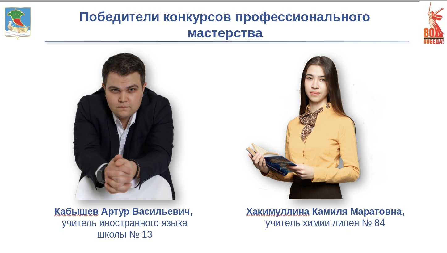 Финалистами республиканского этапа Всероссийского конкурса профессионального мастерства «Учитель года Республики Татарстан» стали учитель иностранного языка школы №13 Артур Васильевич Кабышев; учитель химии лицея № 84 Камиля Маратовна Хакимуллина; учитель начальных классов центра образования № 62 Анна Даниловна Чентаева; учитель татарского языка центра образования № 62, финалист Всероссийского конкурса «Лучший учитель татарского языка» Илиза Дильшатовна Гарипова; воспитатель детского сада №2 Лейсан Миннихановна Хайруллина; педагог – психолог детского сада № 37 Алена Геннадьевна Петрищева; советник директора по воспитанию сош № 19 Наталья Петровна Никитина.