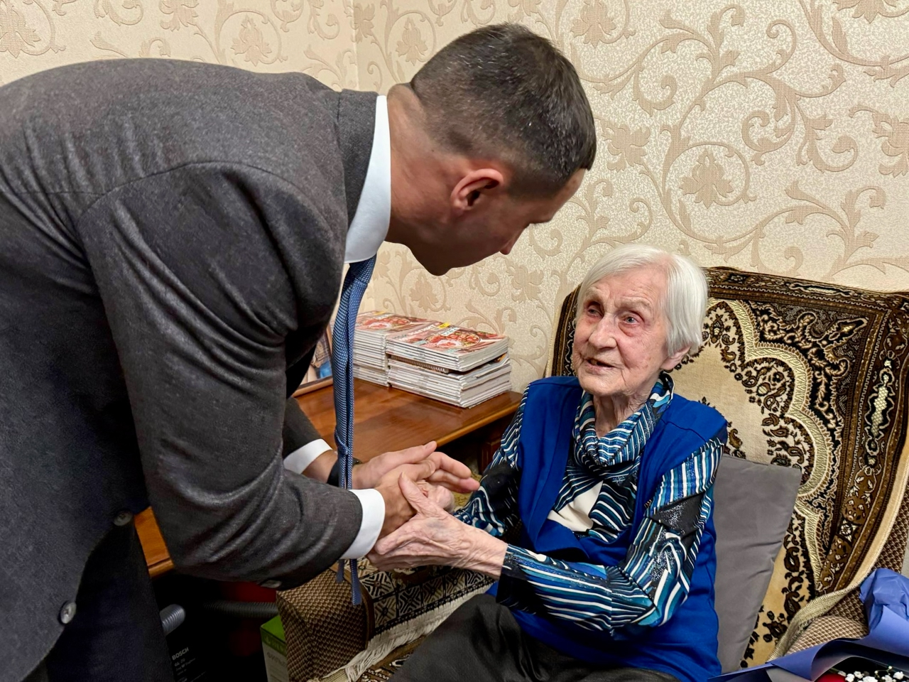Награду от имени Раиса Республики Татарстан вручил Фарид Салахов, отметив, что это особо торжественное событие проводится в Год 80-летия Великой Победы. Фарид Салахов поблагодарил Надежду Филипповну за героический труд как в годы войны, так и в мирное время:
