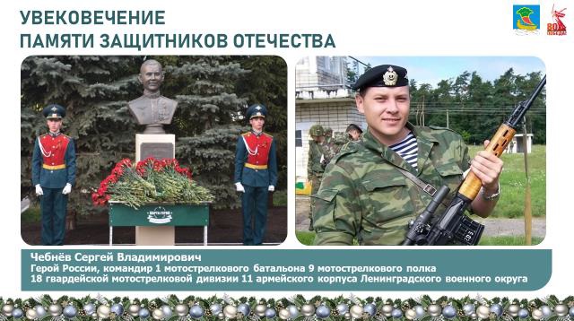«За мужество и героизм, проявленные в ходе выполнения боевых задач в зоне специальной военной операции, наши воины удостоены высоких государственных наград. К сожалению, среди них есть и погибшие воины. Их имена навечно внесены на стену у мемориала «Родина-мать» у Вечного огня. Высокое звание Героя России присвоено нашему земляку Сергею Чебневу, который ценой своей жизни спас сотни своих сослуживцев. В память о подвиге Героя на Аллее Славы парка Победы и в школе 56, где учился Сергей, установлен бюст».