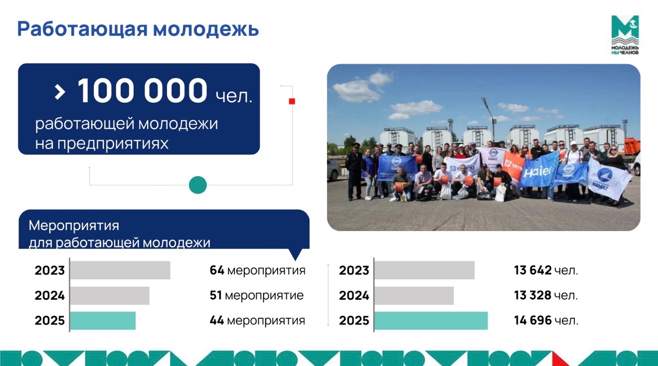Акцент в работе с молодежью сделан на взаимодействии с работающей молодежью. Поддержка и развитие структур по работе с молодежью осуществляется через деятельность общественной организации «Совет молодежи предприятий и организаций города Набережные Челны», который объединяет 30 предприятий, организаций и учреждений.