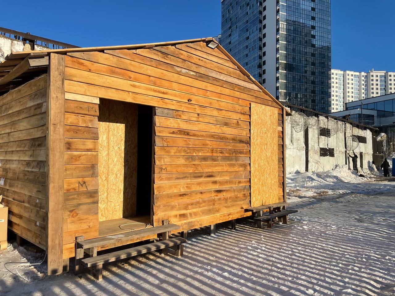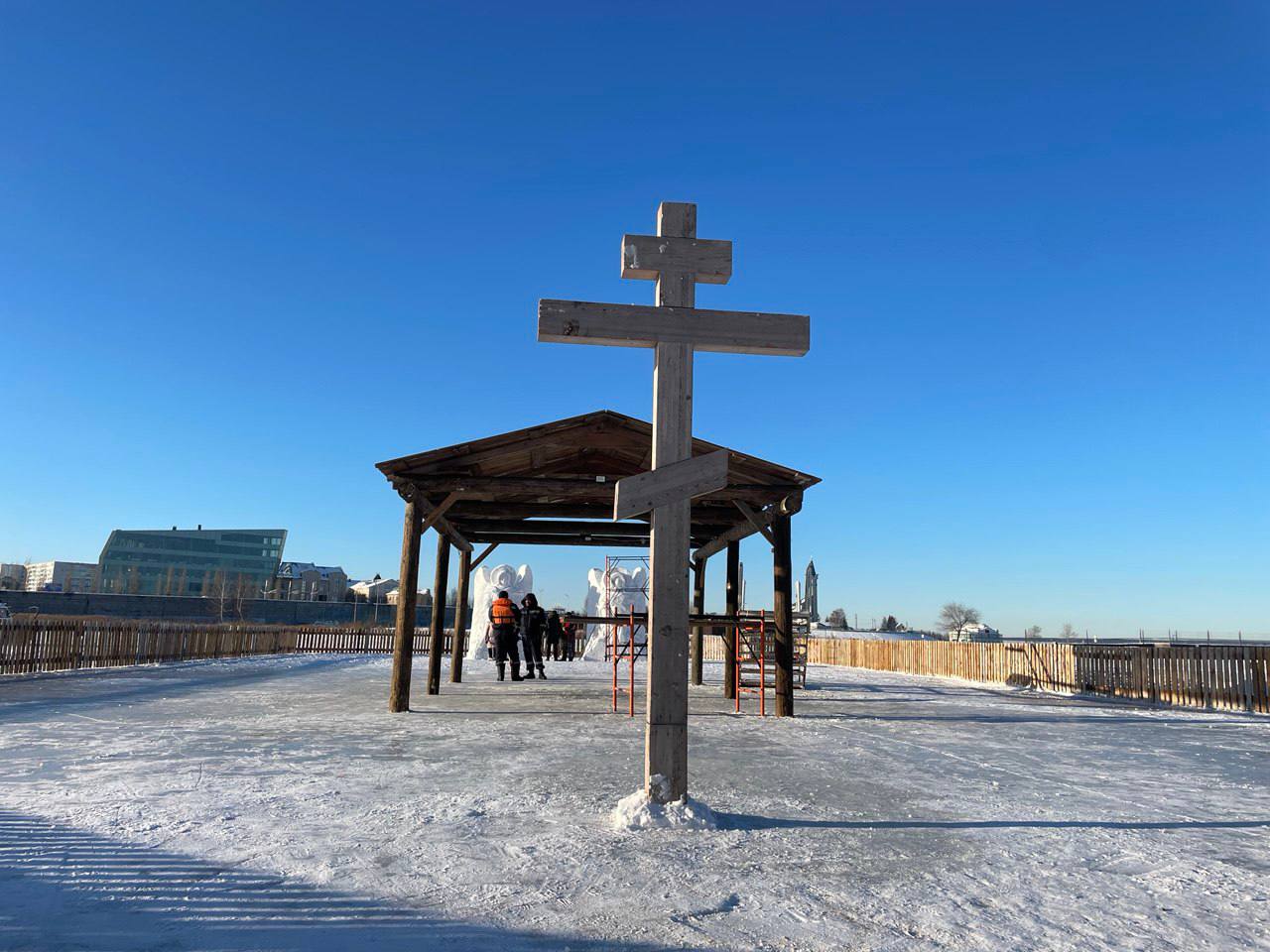 Работы на Мелекеске идут почти месяц. Площадку постоянно очищают и укрепляют. Построены ограждение, навес над купелью, раздевалки, чайные домики. В праздник для верующих организуют горячий чай.