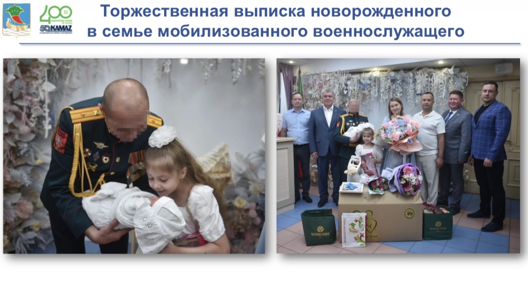 По поручению мэра города Наиля Магдеева для семей мобилизованных организованы персональные торжественные выписки новорожденных с вручением материальной помощи в размере 100 тысяч рублей от города и подарочных наборов от Республики Татарстан. Уже выписано 69 малышей.