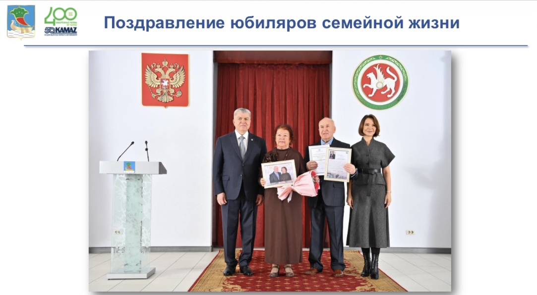 В 2025 году челнинский Дворец торжеств поздравил более 140 пар, отметивших серебряные, золотые и бриллиантовые свадьбы. Для юбиляров, которые не могут приехать, поздравления организуют на дому.