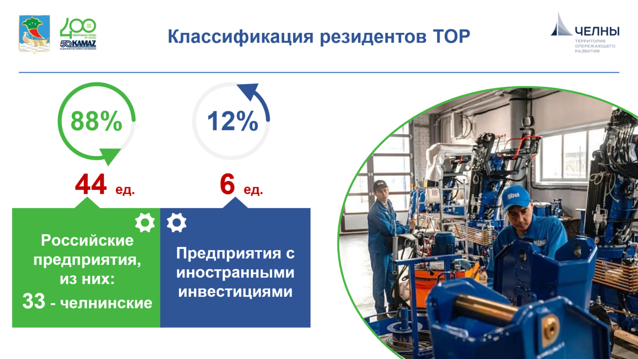 За десятилетний период работы в режиме ТОР в Набережных Челнах зарегистрировано 50 резидентов. Общий объем инвестиций в экономику составил более 51 млрд рублей. ТОР «Набережные Челны» занимает лидирующие позиции по показателям деятельности среди аналогичных территорий республики. Первым резидентом, внесенным в федеральный реестр, стал Агропромышленный комплекс «Камский», являющийся сегодня одним из ведущих предприятий мясоперерабатывающей отрасли региона. Крупнейшим резидентом по объему инвестиций выступает завод по производству бытовой техники Haier. Компания создала единственный в России монобрендовый парк по производству бытовой техники, обеспечив тысячи рабочих мест в высокотехнологичном секторе.