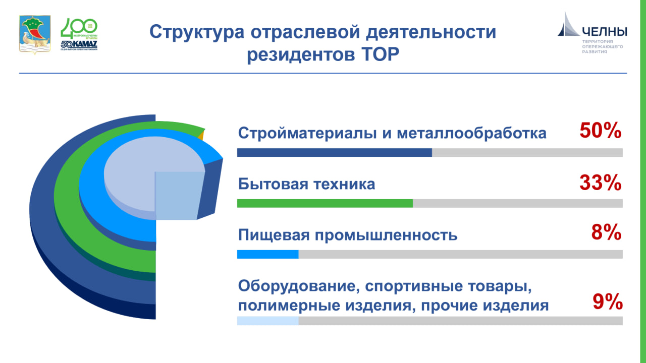 Подавляющее большинство резидентов ТОР (88%, или 44 компании) составляют российские предприятия, причем значительная часть проектов инициирована местным бизнесом. Это свидетельствует об эффективности инструмента ТОР для стимулирования внутренних инвестиций. Каждый третий резидент разместил производственные мощности на территории 13 промышленных и индустриальных парков города. В структуре отгруженной продукции преобладают сфера производства стройматериалов и металлообработки (50%), а также производство сложной бытовой техники (33%).