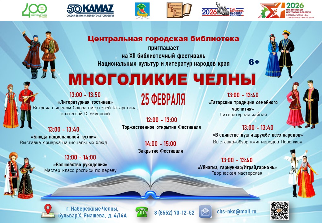 25 февраля в Центральной городской библиотеке состоится Библиотечный фестиваль национальных культур и литератур народов края «Многоликие Челны». Мероприятие соответствует целям национального проекта «Семья». Фестиваль организует национально‑краеведческий отдел Центральной городской библиотеки; в нём примут участие представители разных национальностей, проживающих в Набережных Челнах.