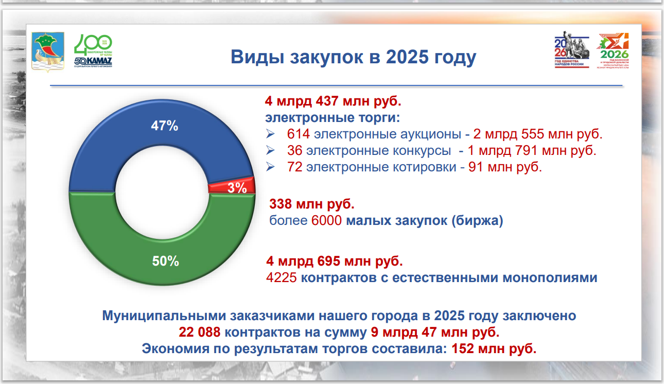 В 2025 году для муниципальных предприятий проведено 427 электронных конкурсов, аукционов и запросов котировок на сумму 13 млрд 100 млн рублей (экономия по результатам торгов составила 54,5 млн рублей). На биржевой площадке проведено 1 138 закупок на сумму 349,4 млн рублей (экономия по результатам торгов составила 33,4 млн рублей).