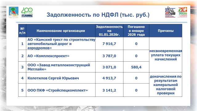 Задолженность по налогу на доходы физических лиц к началу года вырослана 52 млн рублей, подчеркнула Светлана Мулюкова: «Необходимо отметить, что сумма задолженности по НДФЛ