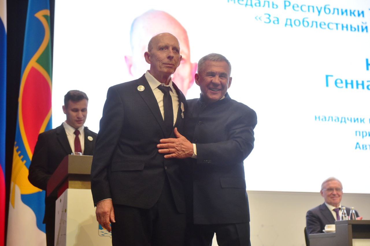 За большой вклад в развитие отечественного машиностроения и многолетний плодотворный труд медалью Республики Татарстан «За доблестный труд» награждены работники ПАО «КАМАЗ» наладчик Автомобильного завода Геннадий Комендюк и мастер участка Литейного завода Алексей Чулков.