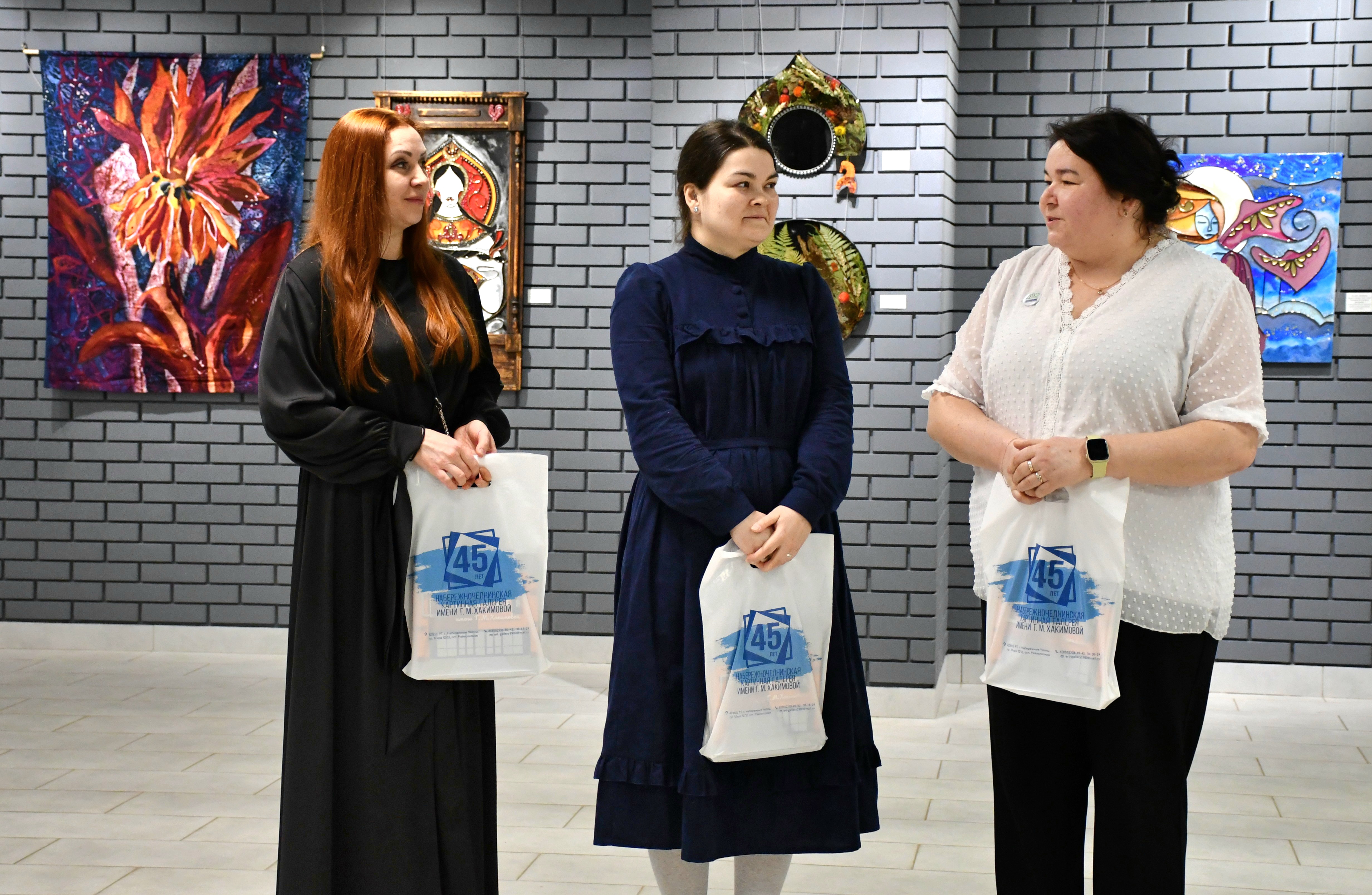 Торжественное открытие прошло в тёплой, дружеской атмосфере. Заместитель директора картинной галереи Рузия Валиулина поздравила художниц с премьерой и вручила им каталог, посвящённый 45‑летию галереи.