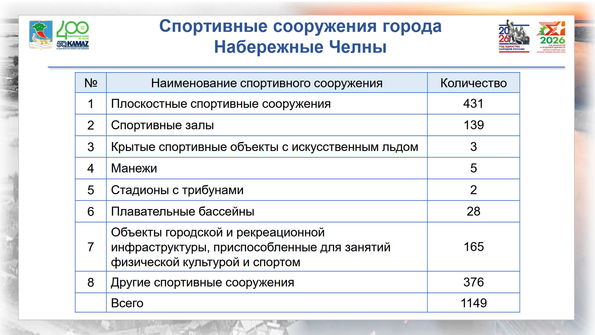 В муниципальных учреждениях развивается 35 видов спорта. Подготовку проходят 9,5 тыс. спортсменов, из которых 7,9 тыс. тренируются на бюджетной основе. По итогам 2025 года воспитанникам присвоено 2,5 тыс. массовых разрядов, 106 званий кандидатов в мастера спорта, 24 звания мастера спорта и одно звание мастера спорта международного класса. В состав сборной Республики Татарстан включены 439 местных атлетов, в сборную Российской Федерации — 38. На соревнованиях различного уровня, от республиканских до международных, городские спортсмены завоевали 2 761 медаль.
