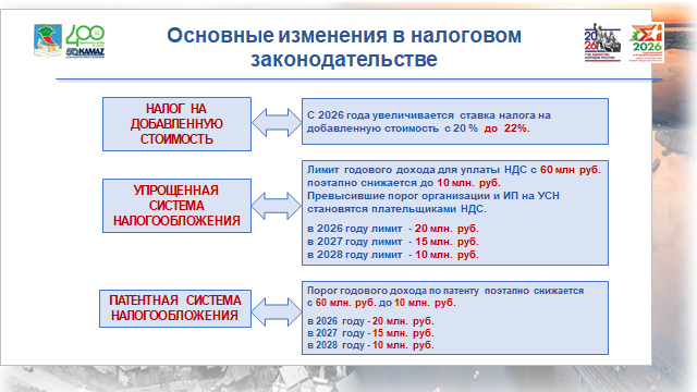 Важные изменения в налоговом законодательстве, вступившие в силу с 2026 года, включают повышение базовой ставки НДС до 22% и расширение круга плательщиков налога. Более подробно с изменениями в налоговом законодательстве можно ознакомиться на официальном сайте ФНС России