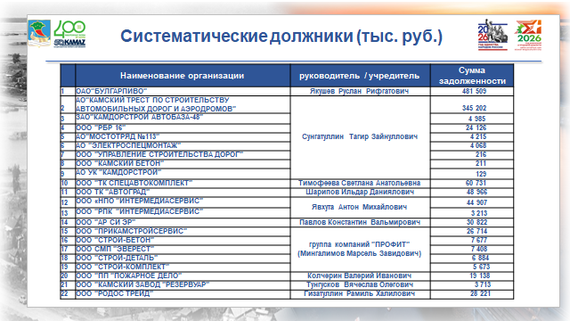 Диана Сагетдинова выделила и добросовестных плательщиков: "Мы ценим вклад социально ответственных налогоплательщиков, которые не допускают задолженности и строго соблюдают налоговое законодательство. Призываю всех следовать примеру этих организаций, которые обеспечивают своевременность и полноту уплаты налогов".