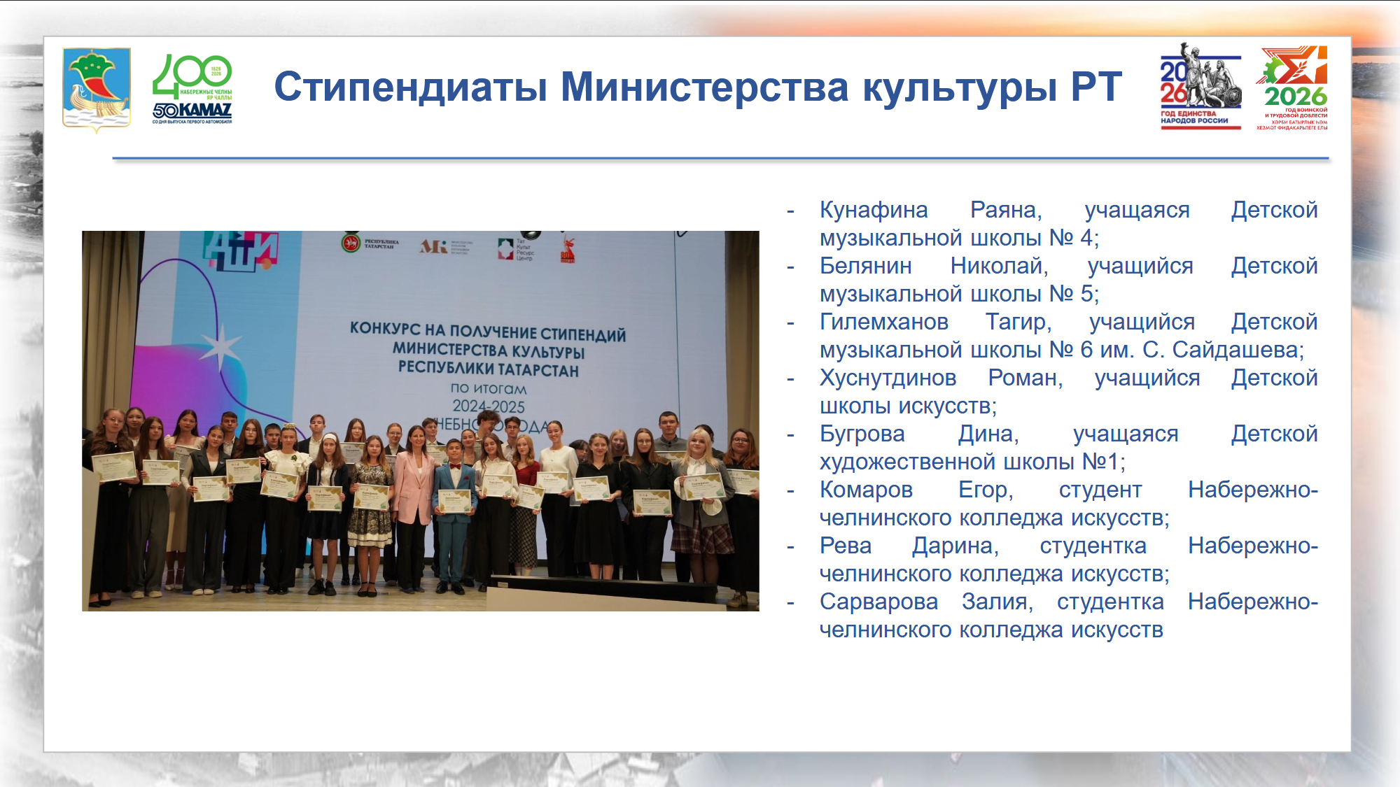 Так, пять учащихся детских школ искусств и три студента колледжа искусств стали стипендиатами Министерства культуры Республики Татарстан. 10 учащихся получили стипендии от Мэра города, и еще 10 – от различных благотворительных фондов.