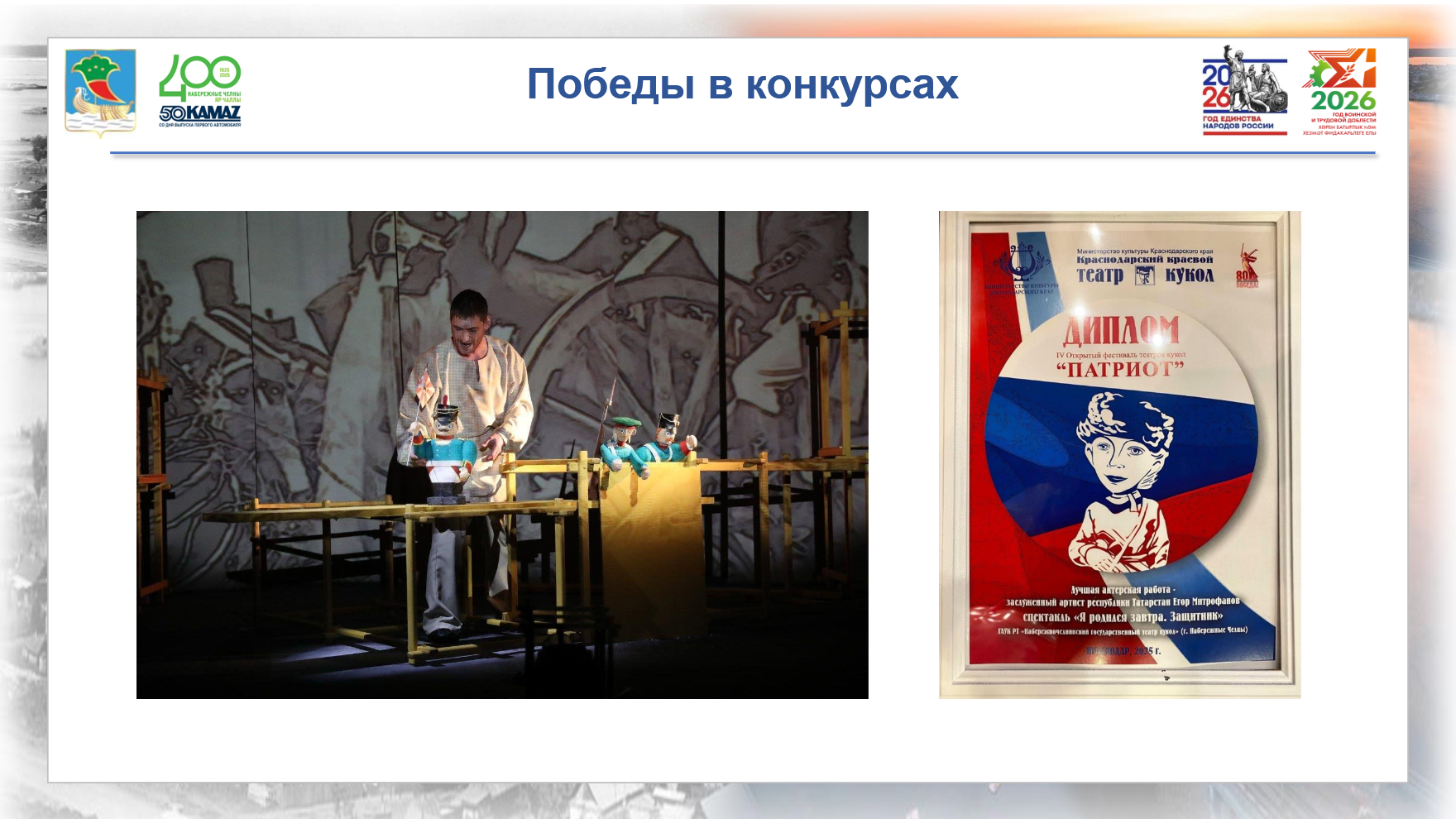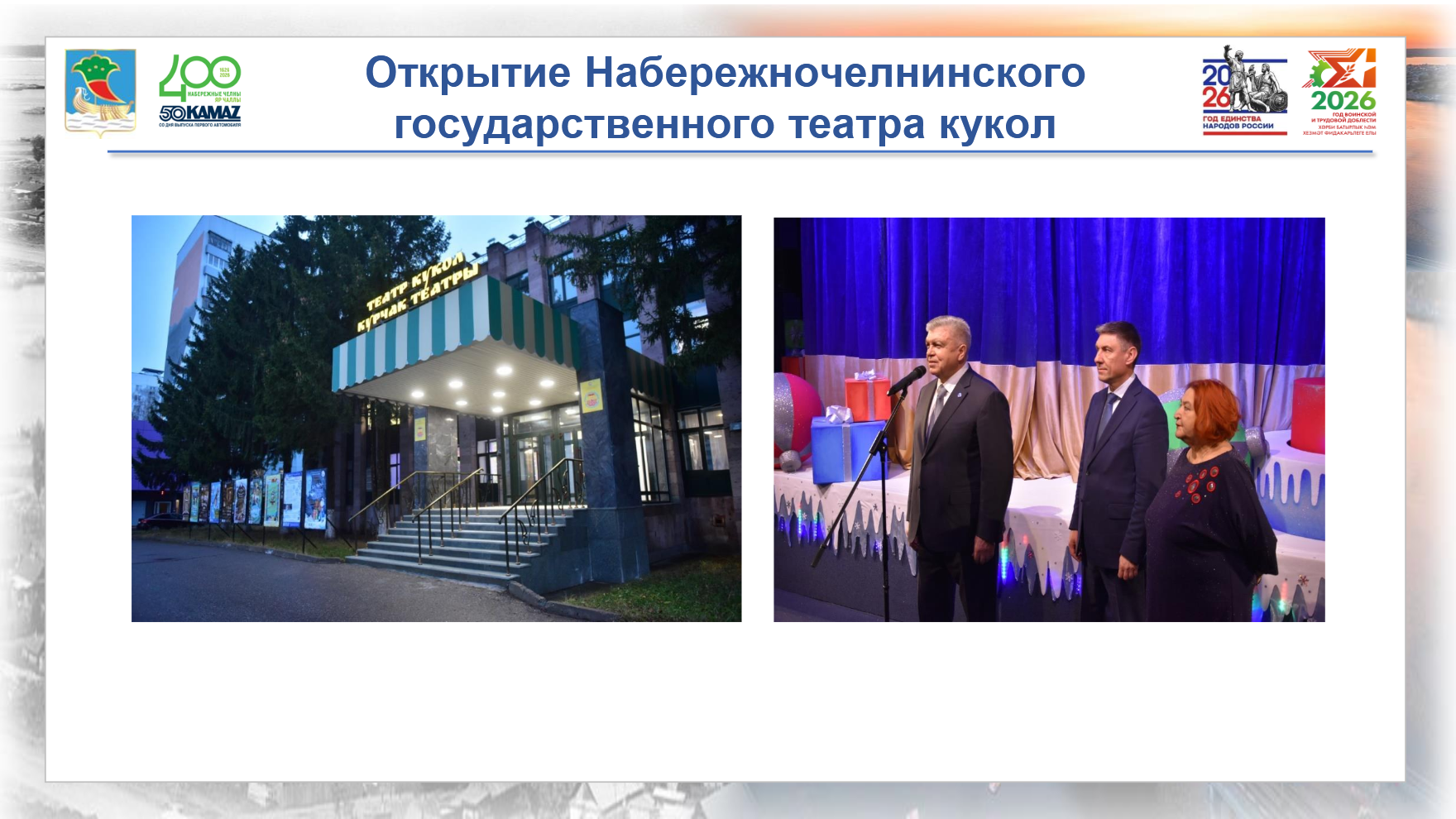 В 2025 году в театрах города состоялось множество премьер: Набережночелнинский государственный театр кукол – восемь новых постановок; Набережночелнинский государственный татарский драматический театр имени Аяза Гилязова – семь новых постановок; Русский драматический театр «Мастеровые» – 10 новых спектаклей. Во всех трех театрах отмечается ежегодный рост зрительской аудитории. Знаменательным событием стало открытие театра кукол после капитального ремонта – одного из любимых мест семейного отдыха в городе.