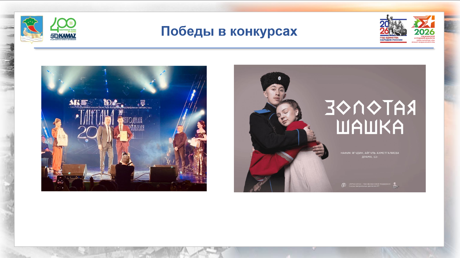 Кроме того, высокие награды заслужили и звезды сцены. Так, актёр татарского драматического театра имени Аяза Гилязова Ильназ Гаффанов стал победителем главной театральной премии Министерства культуры Республики Татарстан «Тантана» в номинации «Дебют». Высокой награды он удостоен за роль Минлебая в спектакле «Золотая шашка».