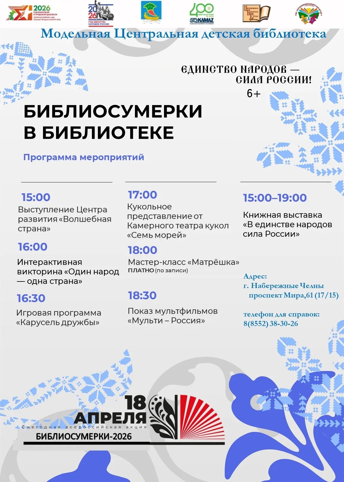Модельная центральная детская библиотека приглашает юных читателей и их родителей на ежегодный праздник дружбы, творчества и взаимного уважения — Библиосумерки «Единство народов — сила России!». В этот день библиотечное пространство превратится в настоящий калейдоскоп ярких впечатлений.