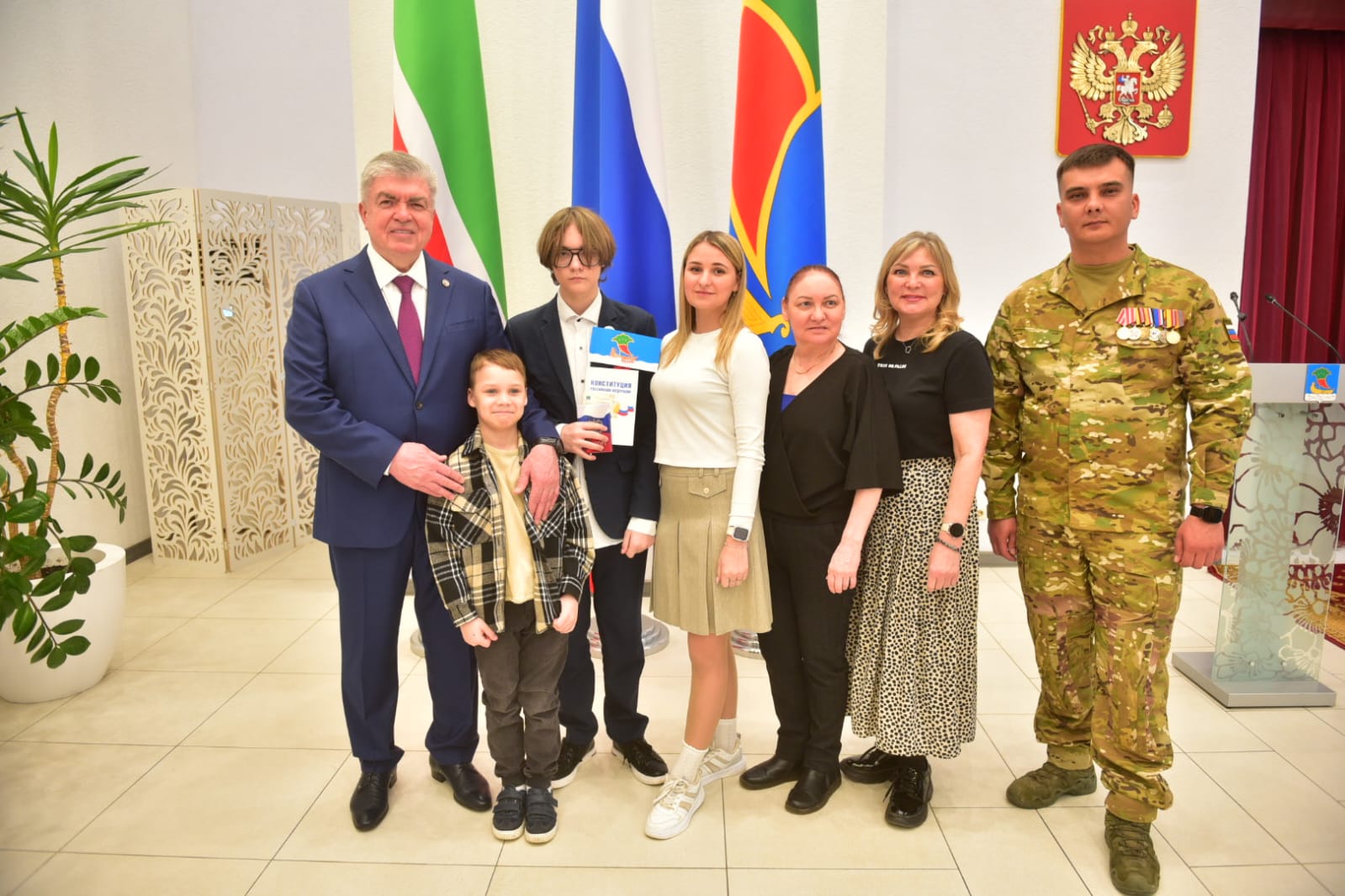 Каждый подросток получил также основной закон страны – Конституцию Российской Федерации, которую должен соблюдать каждый гражданин, флаг с гербом Набережных Челнов.