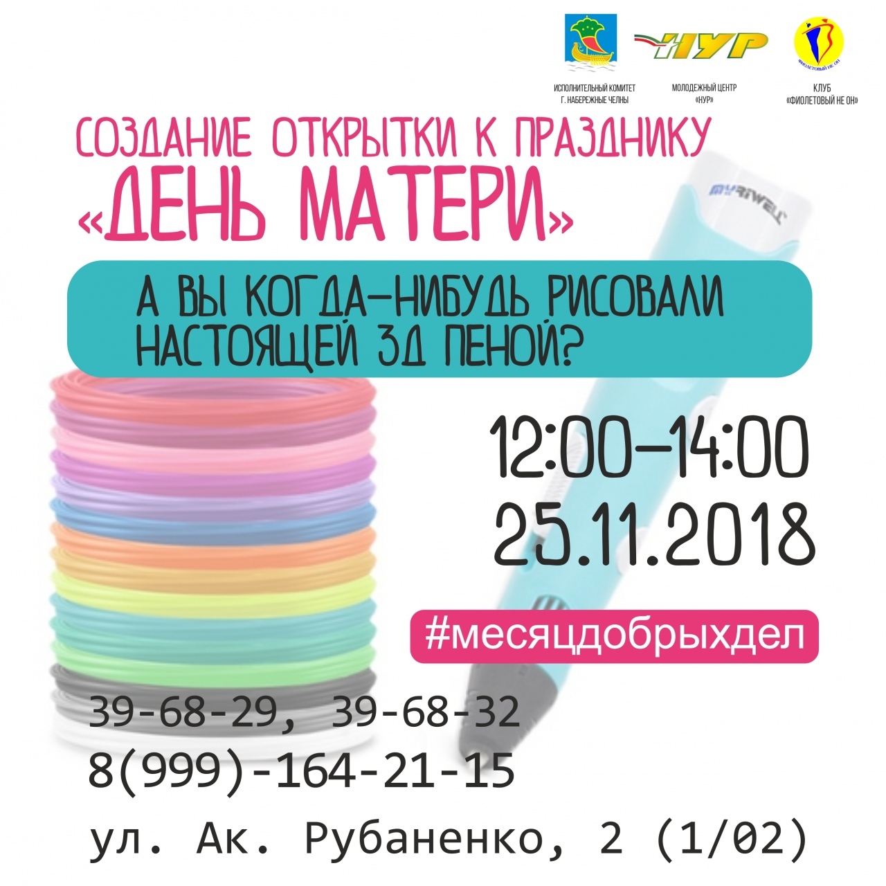 «Шәмәхә НЕОН» иҗтимагый оешмасы Әниләр көне уңаеннан шәһәр чарасы уздыра. Яшь чаллылыларны әниләре белән бергә 3D рәсем ясау буенча мастер-класска чакыралар. Чара программасында Әниләр көненә открыткалар ясау һәм @liana.chocolate шоколад десертларыннан авыз итү.