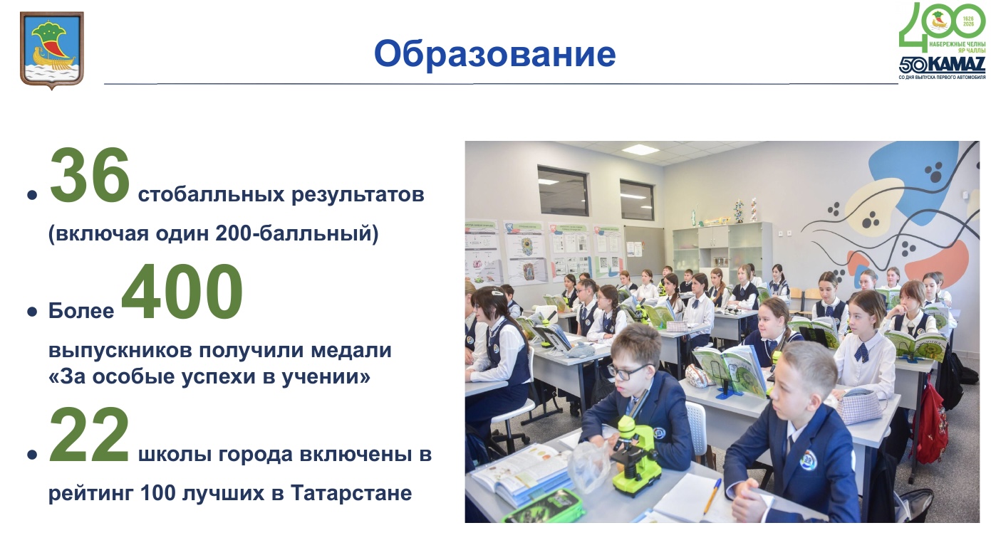 Бүген шәһәрдә алты югары уку йорты, 17 көллият, 83 мәктәп һәм 129 балалар бакчасы эшли. Мәгариф комплексы 130 меңнән артык баланы һәм студентны үз эченә ала. Бу хакта Шәһәр Советының V утырышында Башкарма комитет җитәкчесе Фәрид Салахов сөйләде.